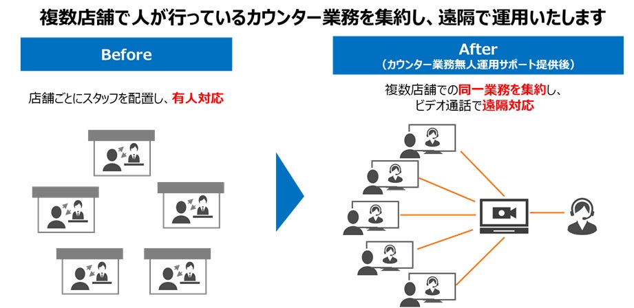 店舗のカウンター業務を、ビデオ通話を活用し、遠隔で運用します。