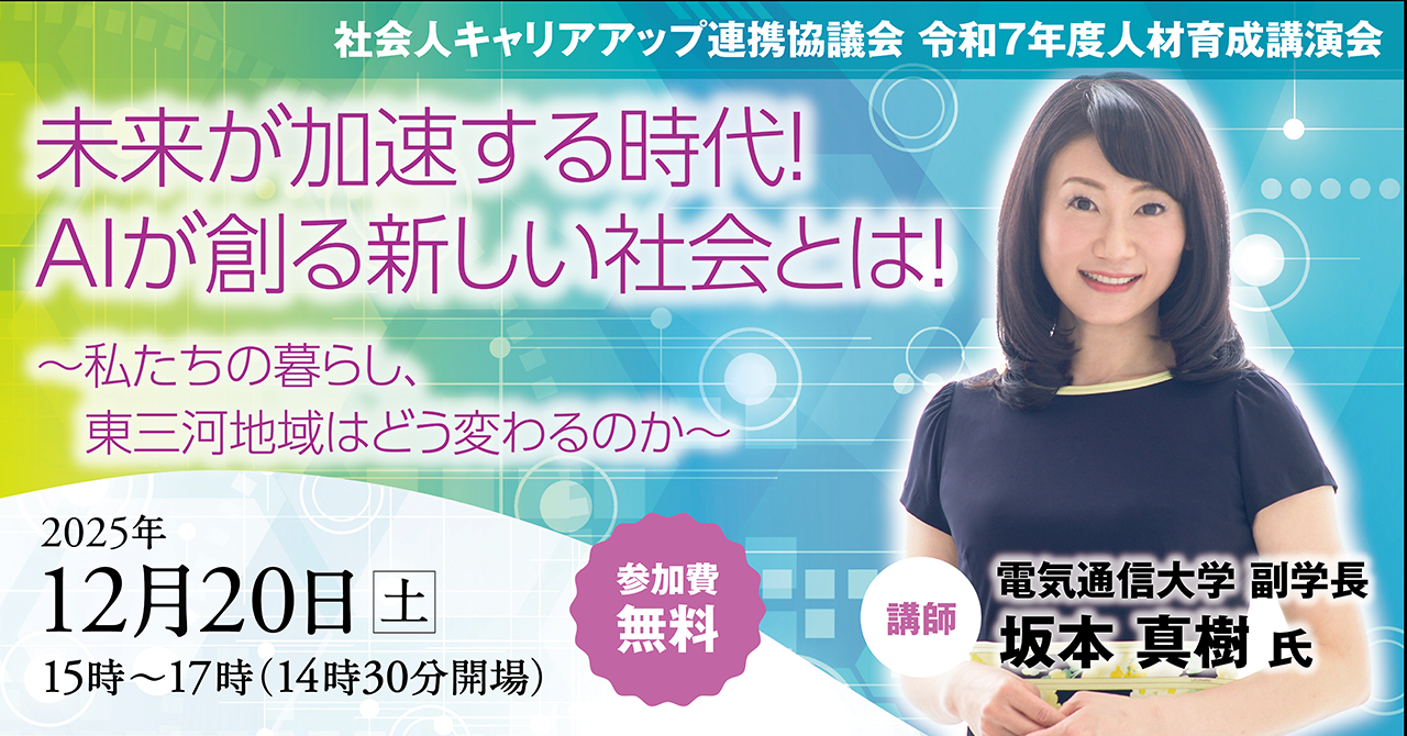 【12/20開催】坂本真樹氏特別講演「未来が加速する時代!AIが創る新しい社会とは!」(社会人キャリアアップ連携協議会主催 令和7年度 人材育成講演会)を開催します!
