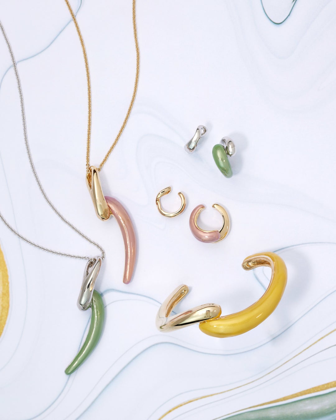 縦長で流れるようなモチーフのラインが胸元をすっきり見せるネックレス、程よいボリューム感が高級感のあるバングル、リバーシブルで着用できる2点セットのイヤーカフをそれぞれスモーキーピンク、バターイエロー、くすみグリーンの3色で展開します。