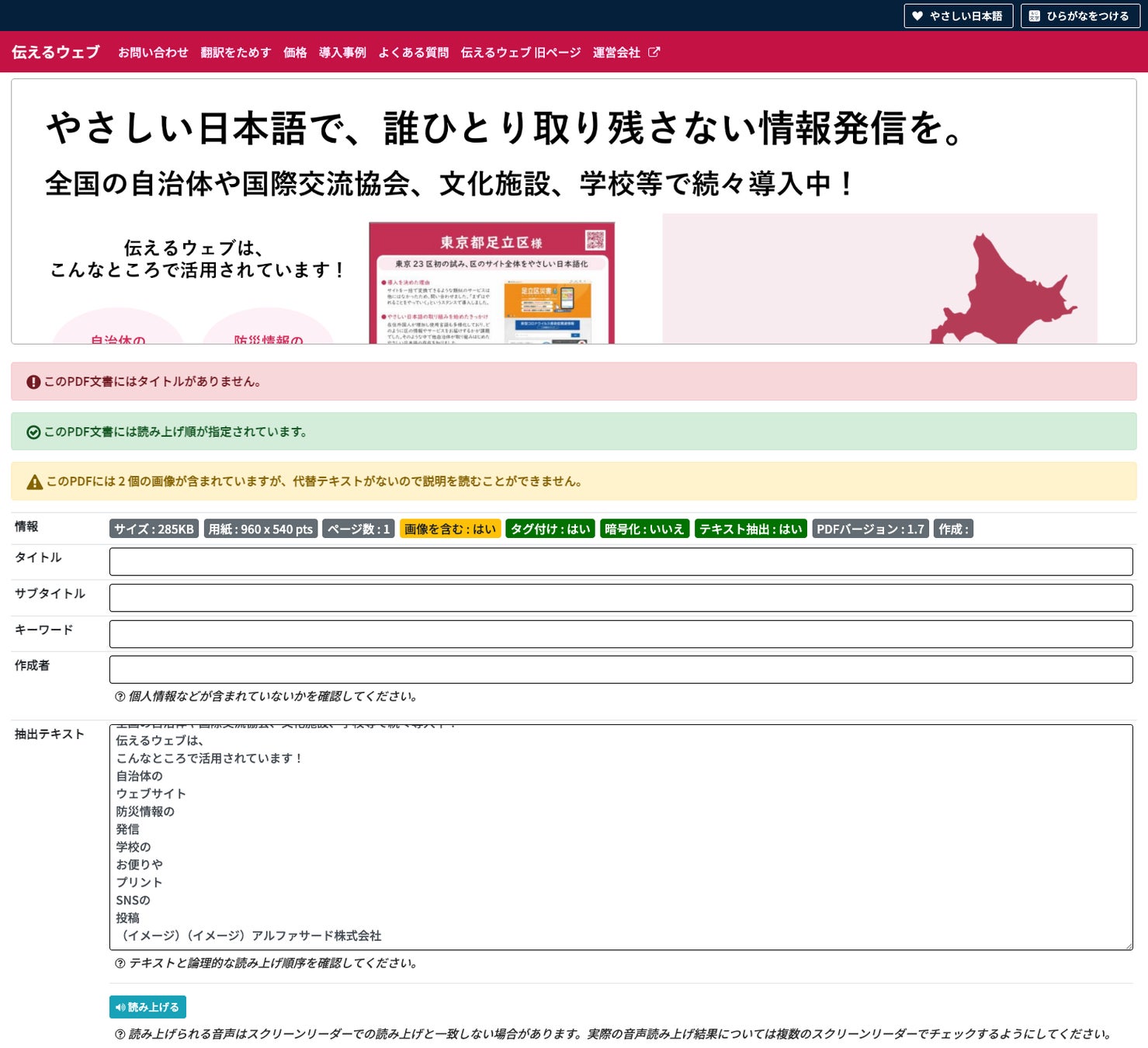 アルファサード株式会社は、無料で PDF のアクセシビリティを自動チェックするオンラインツール「伝えるPDF」をリリースしました。また、チェック後に、最適な音声読み上げ PDF に改善する新サービスを開始いたします。