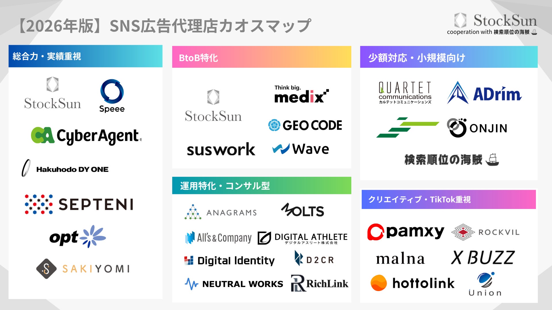 StockSun株式会社(本社:東京都新宿区、代表取締役:岩野 圭佑)は、SNS広告運用に強みを持つ代理店32社(StockSunの複数カテゴリー掲載含む)を5カテゴリーに分類した「SNS広告代理店カオスマップ【2026年版】」を、検索順位の海賊と共同で作成し公開いたしました。