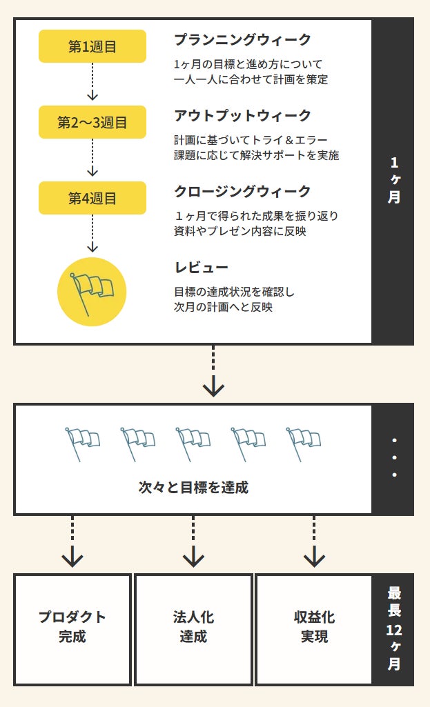 「自分だけのビジネスを形にしたい」個人・チームが、最短 6 か月〜最長 12 か月 でプロダクトを完成させ、法人化・収益化まで走り切る仕組みを提供します。必要なのは “意欲” だけ。場所・経験・資金のハードルを超えて、誰もがビジネスオーナーになれるスタートラインを用意しました。