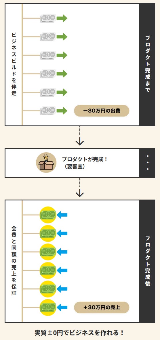 これにより「実質0円で」リスクなくビジネスを立ち上げることができる、独自の返金保証プログラムとなっています。