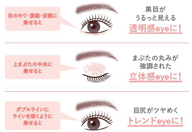 粉砂糖のような繊細なラメは一見控えめでありながらも、表情に合わせて美しくきらめきます。下まぶたに乗せると、涙袋が完成。笑顔になるとさりげなく輝くので、目元のくすみを飛ばしたい大人の方におすすめです。