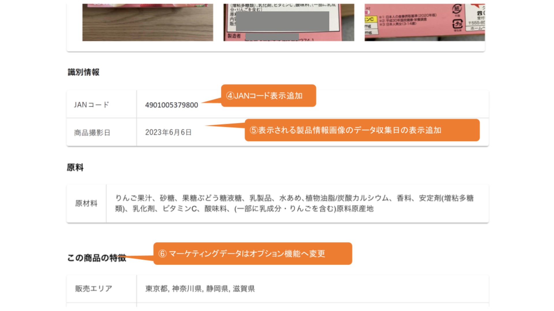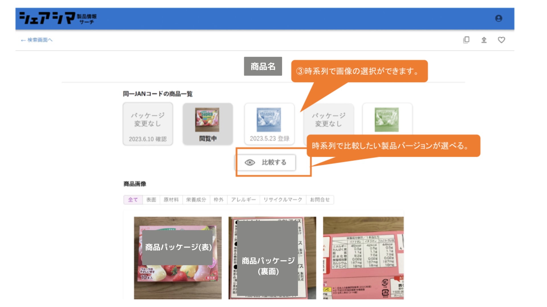 閲覧できる各商品は、パッケージの裏表の画像、原材料の表記内容などを閲覧できます。また製品パッケージに変更が加わった際には、時系列で表示を確認できる仕様となっています。