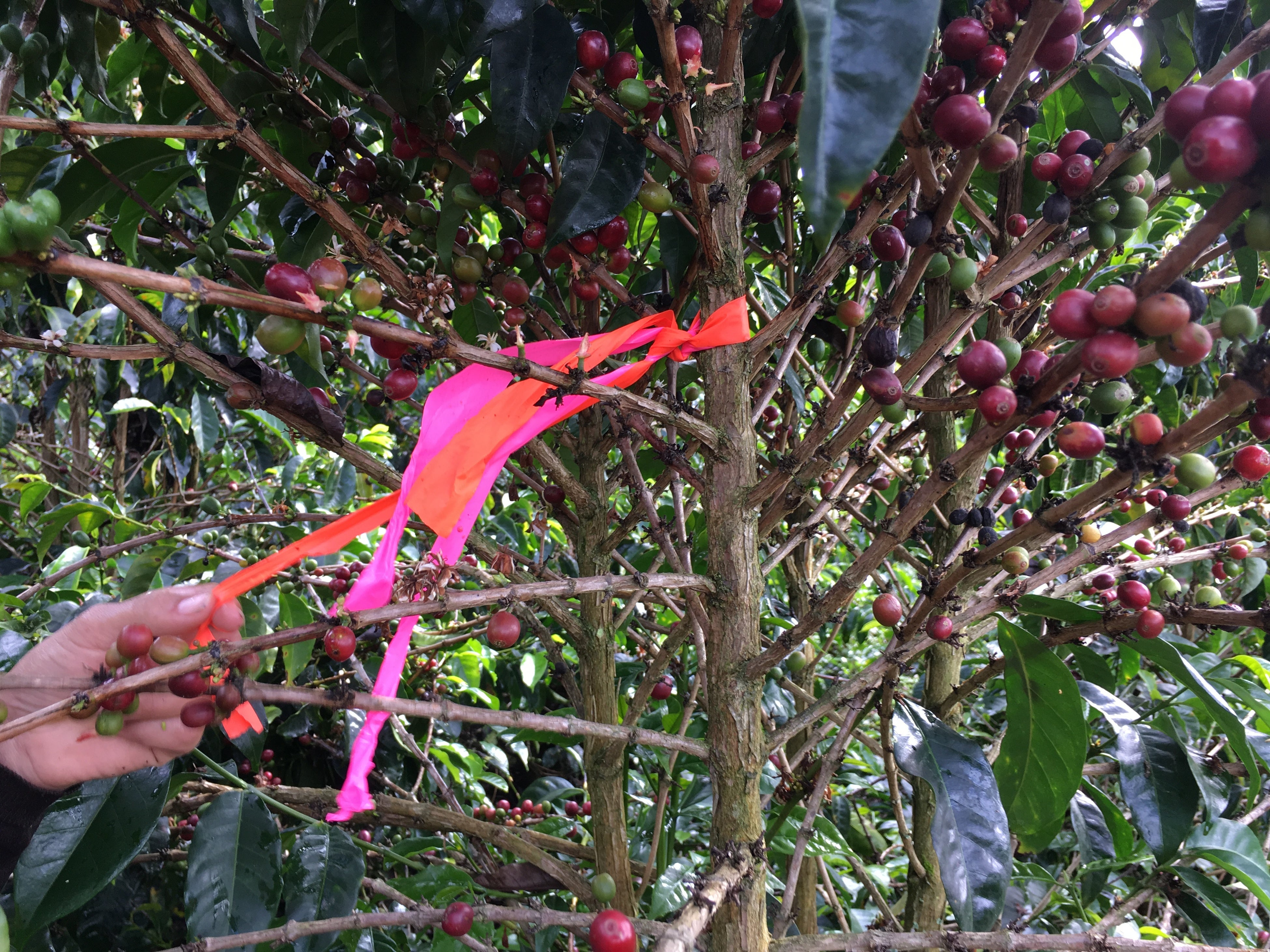 サザコーヒーの鈴木太郎とコーヒーの木。コロンビアのコーヒー農園で8万本の芸者の木を植えており、その中で特別美味しいコーヒーの実を生らす木にオレンジ色のテープをくくりつけている。