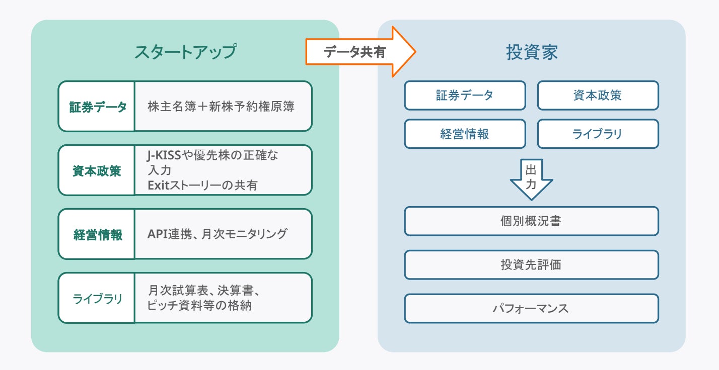 投資家向けには、案件ソーシング、投資先管理、ファンド管理、公正価値評価、LP向けレポート作成支援などの投資関連業務を効率化するサービスを包括的に提供しています。スタートアップ向けには同じプラットフォーム上で、株主総会、取締役会、事前承諾、資本政策、ストックオプション管理などのサービスを提供しています。