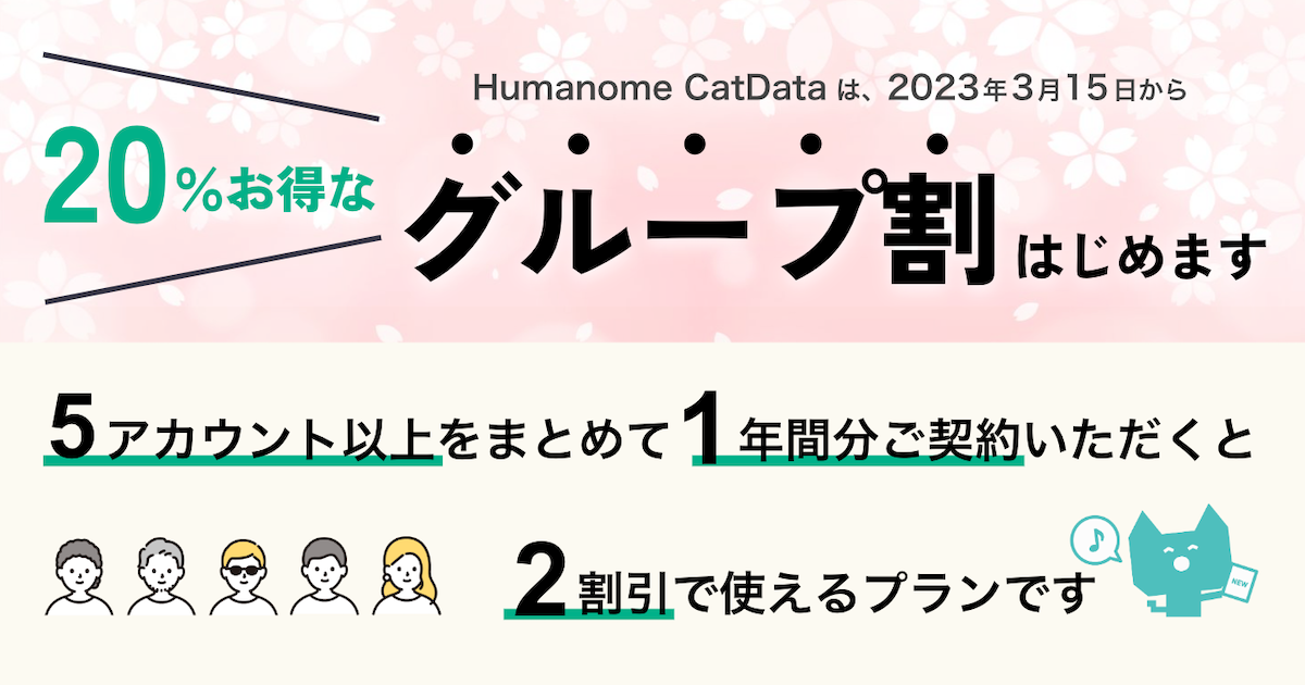 この度の価格改定にあわせて、お得な価格でHumanome CatDataをご利用いただける「グループ割」の提供を新たに開始いたします。5アカウント以上をまとめて1年間分ご契約いただくと、合計金額から20%オフ でご利用いただけるプランとなります。