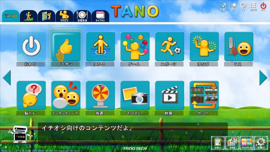 現場の声を元に開発し、理学療法⼠や専⾨家の意⾒を参考に調整・アレンジされた約200種類の豊富なコンテンツは、レクリエーション・リハビリテーション・測定用に開発されており、国内外の福祉施設から病院、⼤学、研究機関、商業施設、⾃治体等、多くの環境で利⽤されています。
