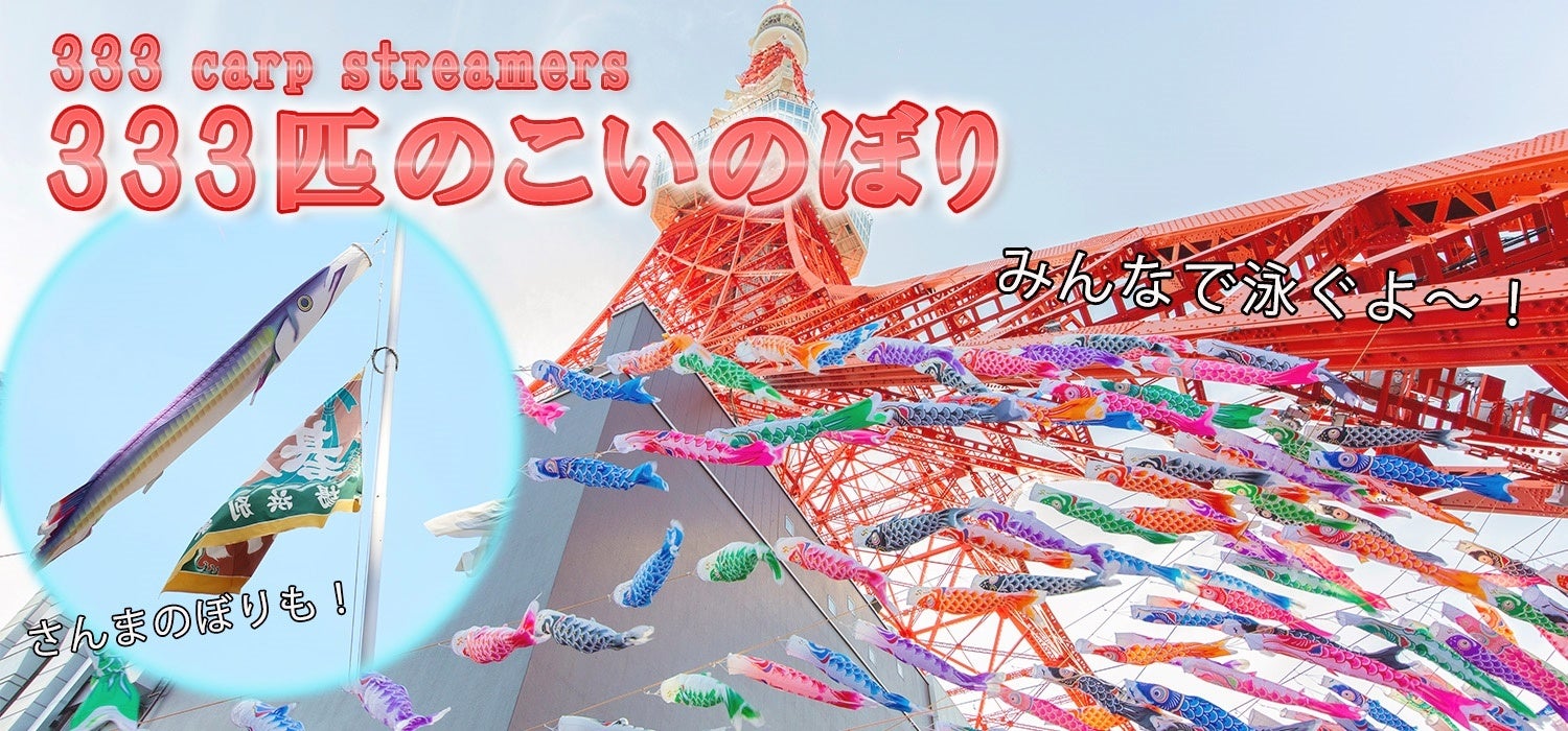 東京タワーでは、春の恒例企画「333匹の鯉のぼり」と一匹の「さんまのぼり」装飾を、ゴールデンウィークを含む5月8日(日)まで、1階正面玄関前に装飾しています。