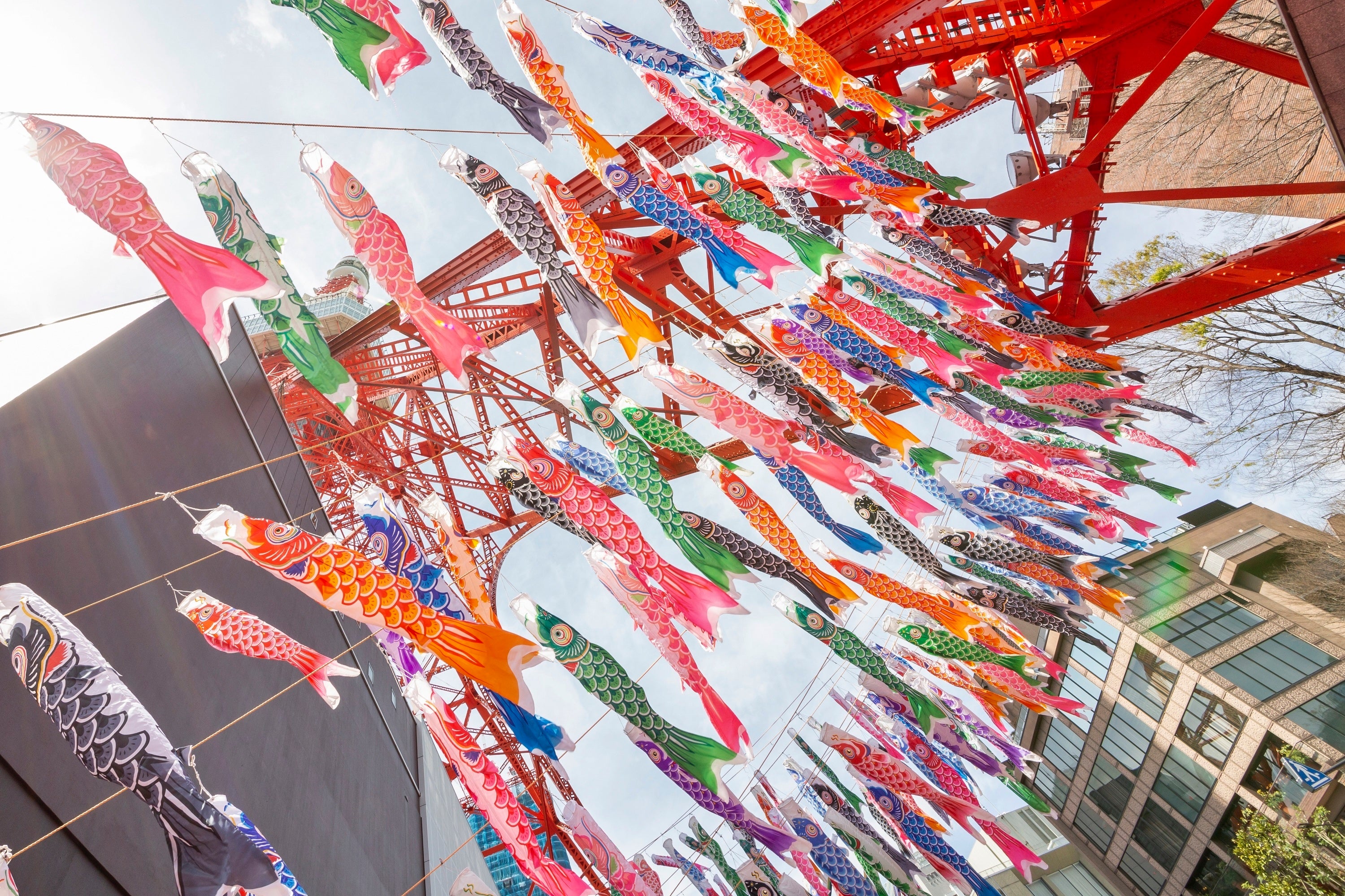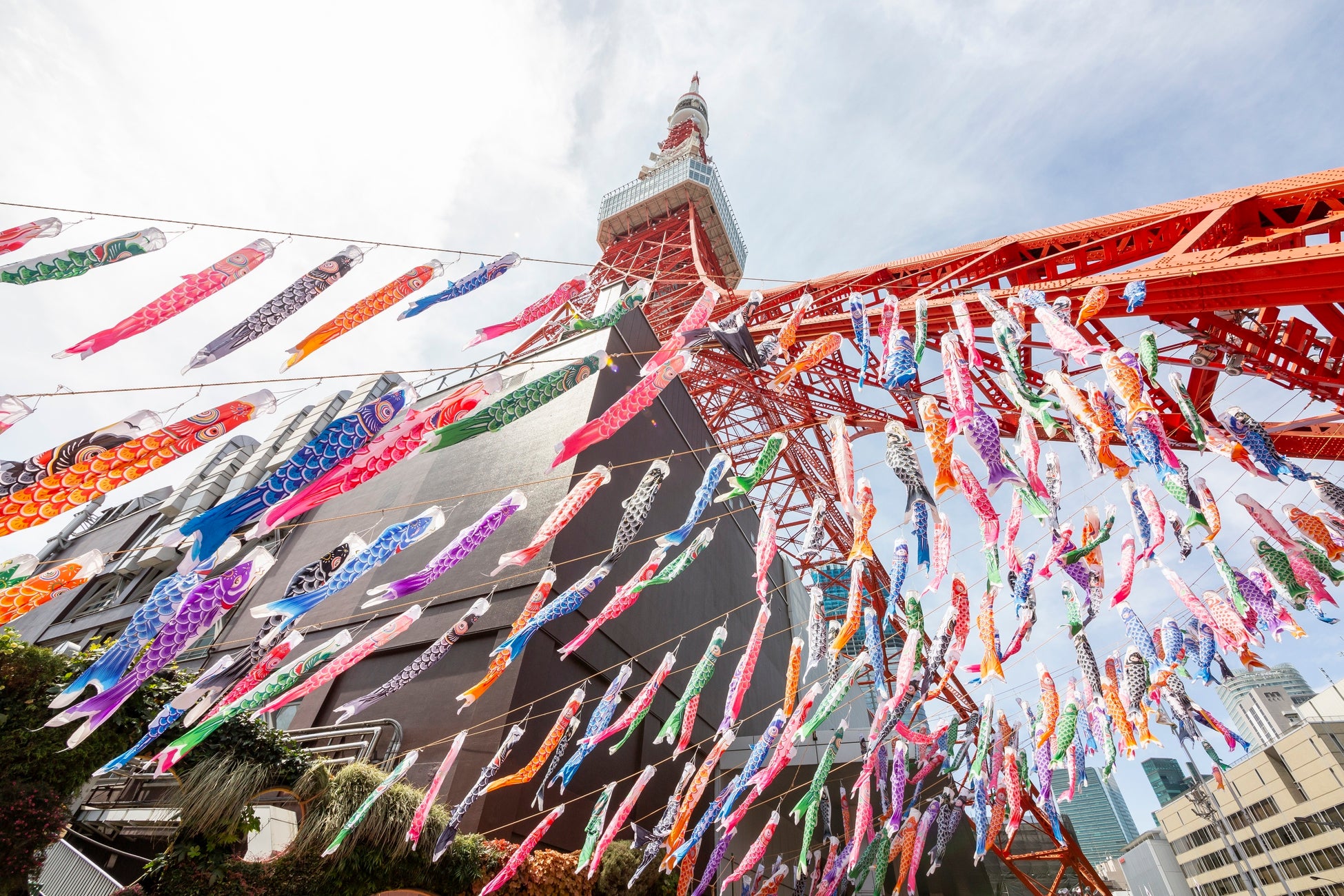 東京タワーのオレンジ色と青空をバックに、東京の中心で鮮やかに泳ぐ333匹のカラフルな鯉のぼり。