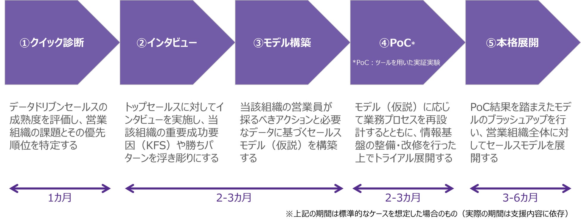 データドリブンセールスソリューションは、「➀クイック診断」「②インタビュー」「③モデル構築」「④PoC」「⑤本格展開」の5つのステップでデータドリブンセールスを営業組織全体に展開します。本ソリューションでは既存の販売・売り上げ結果などの既存データを基にした分析のみならず、企業内で優れた成果を上げているトップセールスへのインタビュー、そしてクニエがこれまで得た知見を組み合わせて具体的かつ実現可能な業務プロセスを設計し、定着まで一貫して支援します。