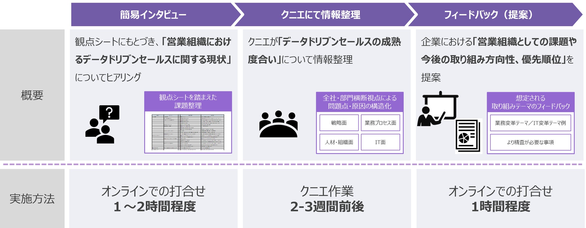 データドリブンセールスの仕組みを構築する前に、簡易的なインタビューを通して営業組織の課題を明確にする「クイック診断」を行います。クニエの営業業務に対する深い業務知見と複数社での全社改革実績に基づき、企業がデータドリブンセールスを実行するための方向性や解決すべき課題を明確化できます。