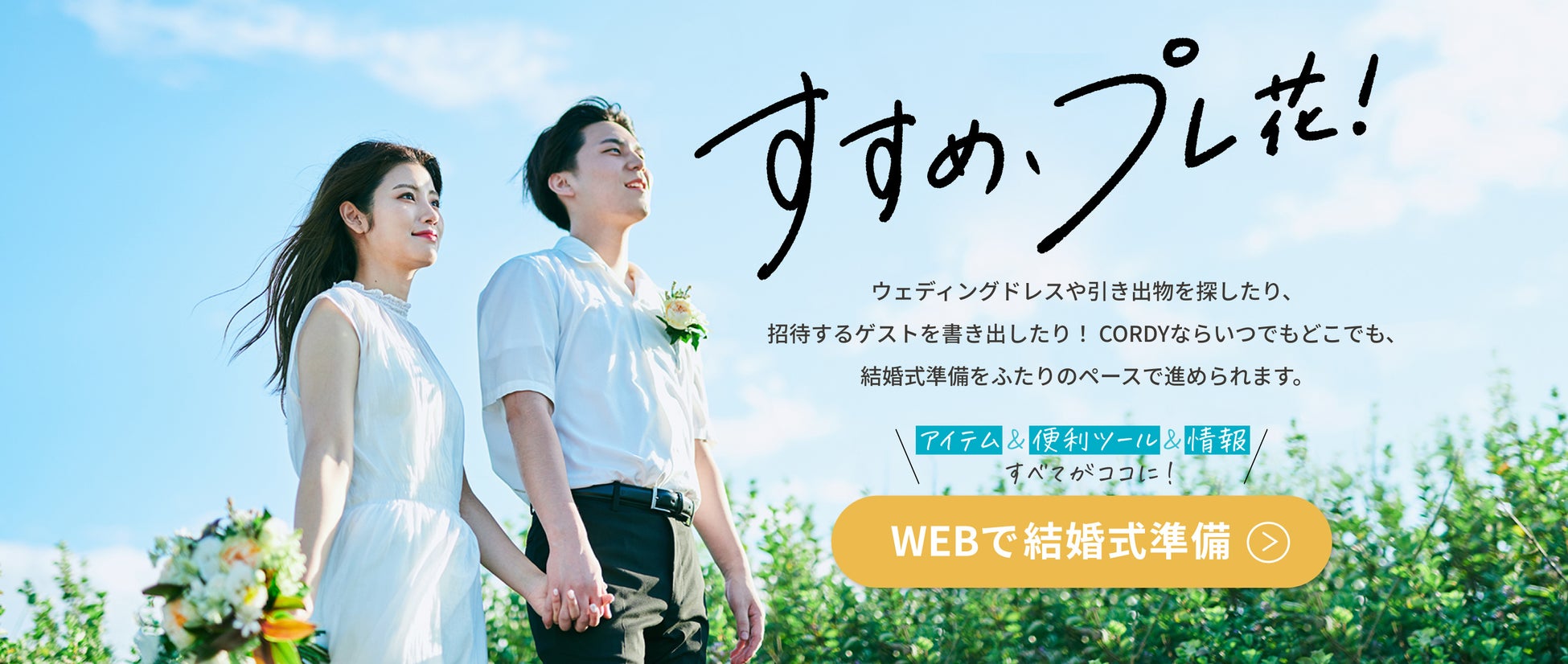 結婚式準備サイト「CORDY/コーディ」は、2019年10月のローンチ以降、ウェディングドレスや引き出物など結婚式に必要なアイテムを取り揃え、予算管理やゲストリスト管理など結婚式準備を便利にするツールを無料提供し、いつでもどこでもふたりのペースで進める結婚式準備をサポートしてまいりました。