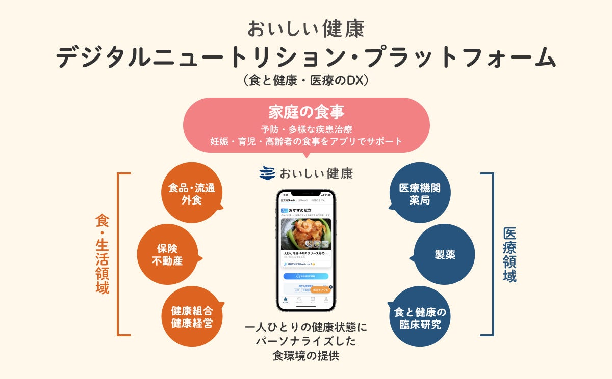 そうした中、「誰もがいつまでも、おいしく食べられる社会の実現」を理念に掲げる当社では、AI による献立・栄養管理支援アプリ『おいしい健康』を提供。一人ひとりの健康状態にパーソナライズした食環境を実現し、医療機関や薬局、製薬会社などとの協業を通じた疾患治療支援、あるいは一般生活者に向けた病気予防を支援してまいりました。これまでブラックボックスであった家庭内の食事と栄養を、デジタルトランスフォーメーション(DX)によって高度に最適化・見える化することは、医療費抑制やQOL向上といった社会課題解決に大きく寄与するものと考えております。