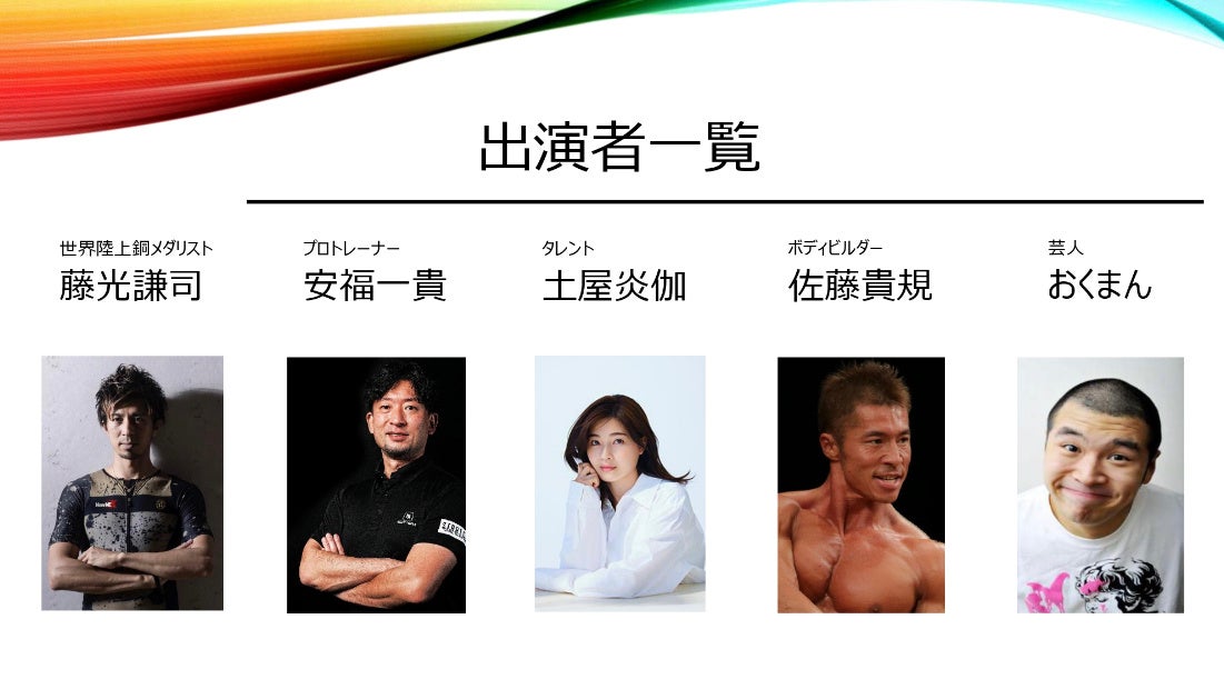 本イベントでは、プロトレーナー、パフォーマンスコーチとして、20年間に渡り元プロ野球選手の高橋由伸氏や片岡易之氏、中島宏之選手をはじめ、数々のトップアスリートをサポートしてきた「安福一貴」、タレントとして様々なバラエティ番組や、情報番組で活躍し、現役のチアリーダーでもある「土屋炎伽」や、ボディビル業界でトップランナーとして長きに渡り牽引してきた「佐藤貴規」など、様々な業界のプロが集結します。