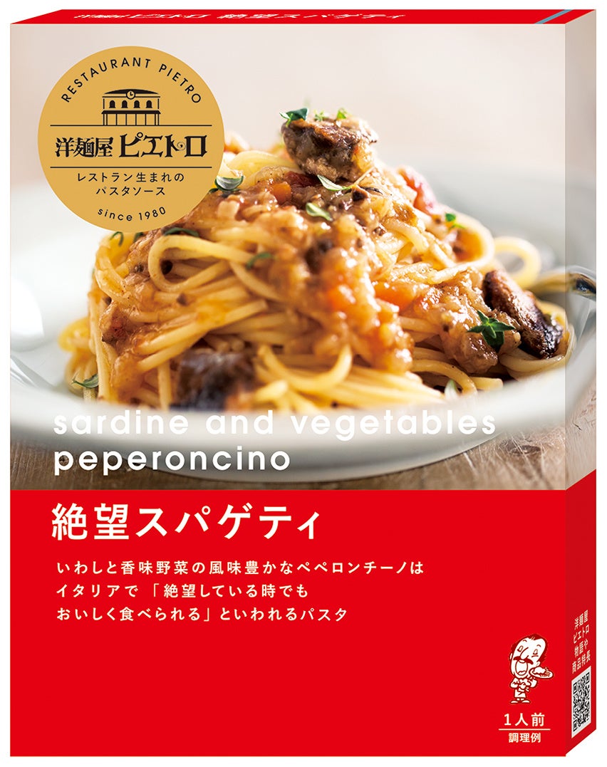 ピエトロレストランで2000年にスタートした、ピエトロのオリジナルメニュー。スタート当時は珍しかった“鰯を使ったパスタ”でしたが、徐々にファンが増え、20年以上、愛され続けている人気メニューです。「絶望している時でもおいしく食べられる」ことが名前の由来。鰯と香味野菜の風味豊かなペペロンチーノです。じっくり揚げて骨までやわらかく食べられる国産マイワシと、たまねぎやにんじんなどの細かく刻んだ香味野菜をたっぷり使用した、鰯の旨みと野菜の香りと甘みをお楽しみいただける一品です。[ピエトロレストラン価格 関東:1,254円、関東以外:1,188円]