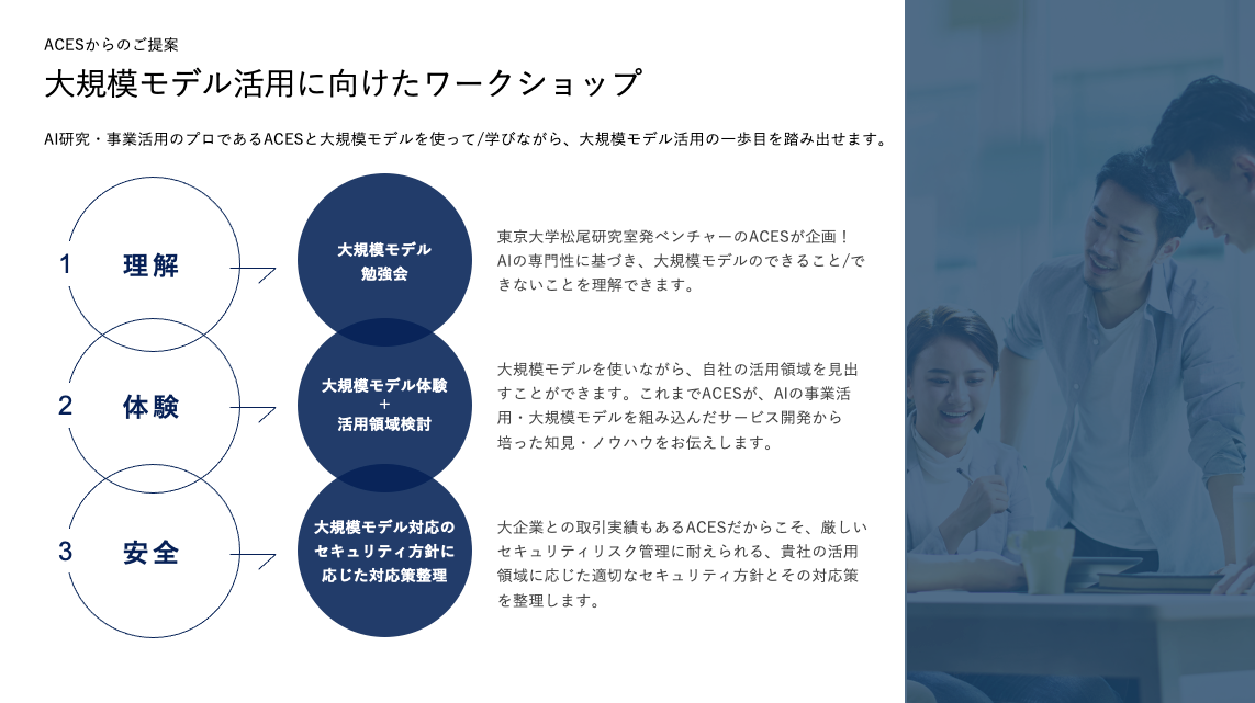 ACESはホワイトペーパーに加え、ChatGPTをはじめとする大規模モデルをビジネス活用するためのワークショップ型プロジェクトを提供しております。