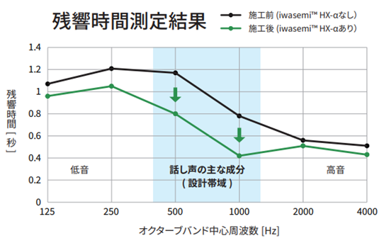 人の話し声に多く含まれる周波数帯域(500-1000Hz)の残響時間が、施工前は平均約1.0秒だったのに対して、施工後は約0.6秒に変化し、残響時間が約40%短くなりました。