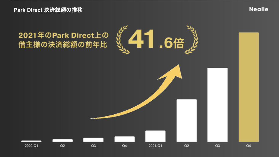 2021年のPark Directの決済総額は前年比41.6倍。導入社数、利用可能な台数の増加とともに、Park Direct上でオンライン契約される借主様も順調に増加しております。