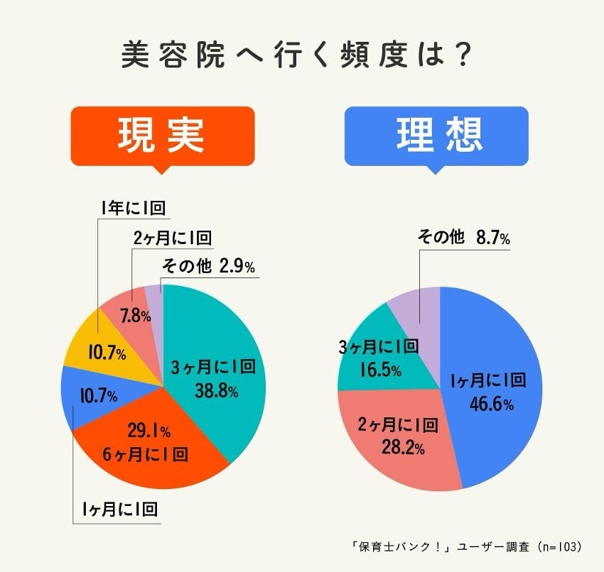 シフト勤務により遅番や土日の業務も存在する保育士さんはとても忙しく、美容院に行く頻度の理想と現実に大きな乖離があることがわかる結果となりました。