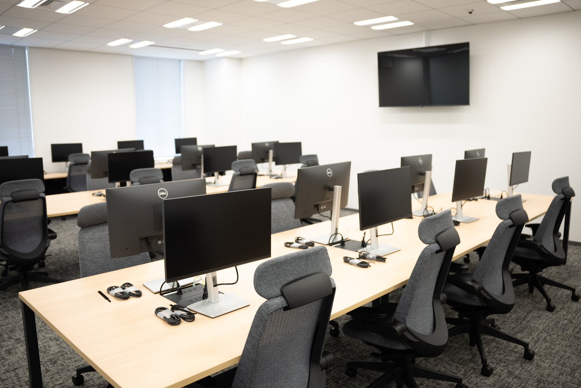 社員研修や社内勉強会で利用できる専用のセミナールームには、机と椅子が一体化したミーティングチェアを設置。