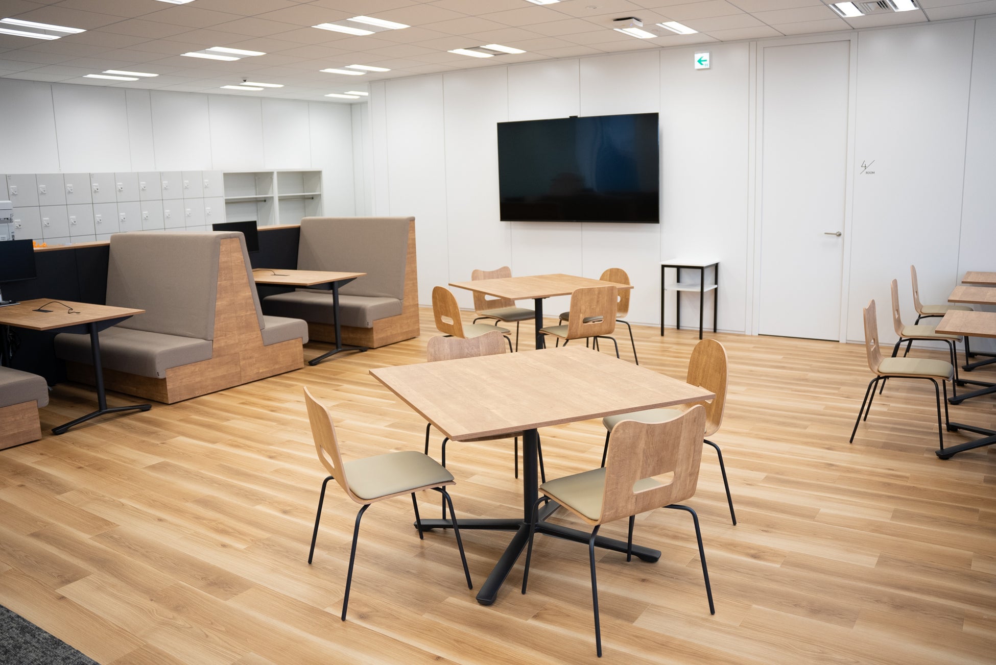 クイックコミュニケーションや社内ミーティングで利用しやすいコミュニケーションエリアをカフェスペースに設置。