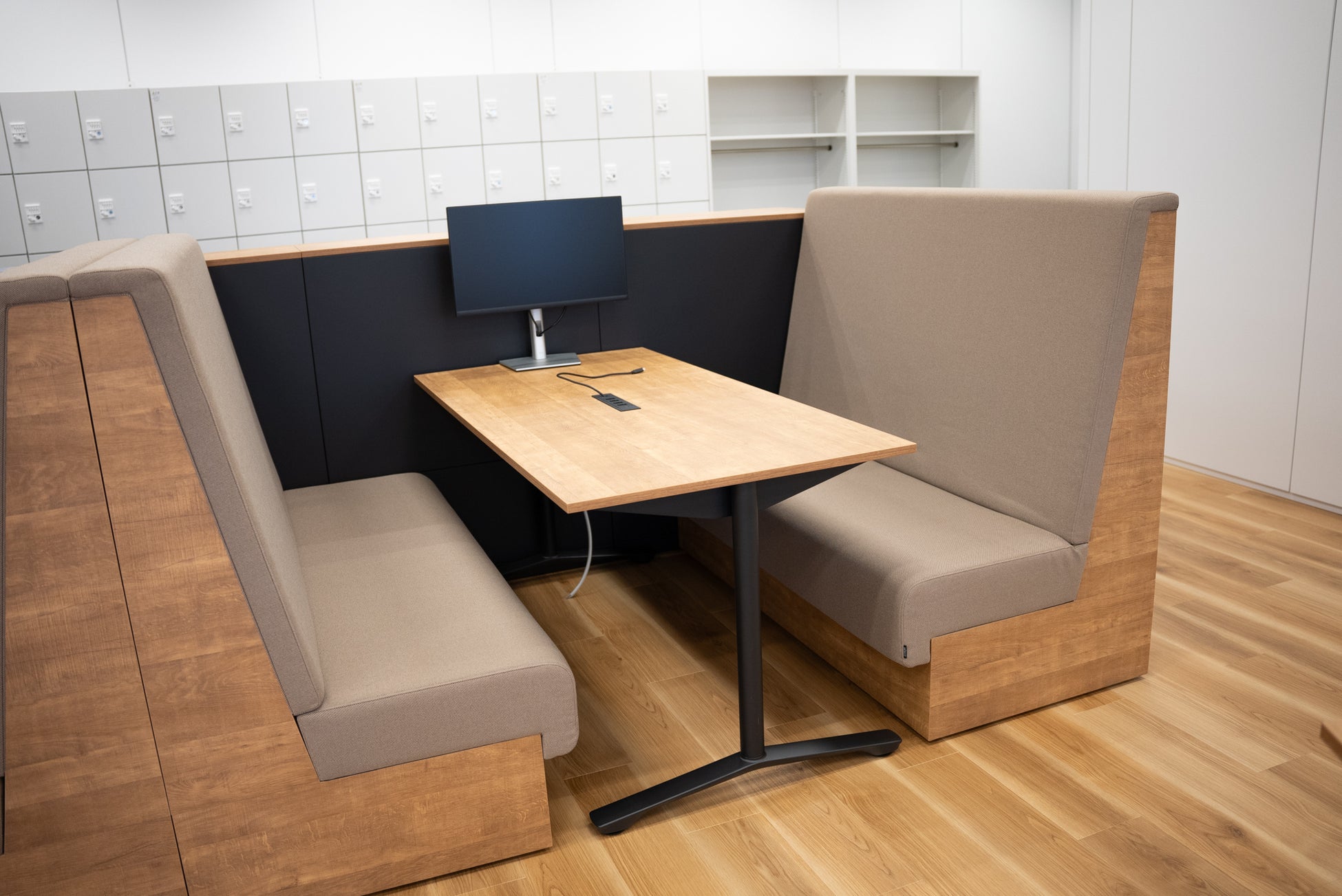業務時間と休憩時間のオンオフを切り替え、メリハリをつけて仕事をできるよう、床と家具を工夫して他のスペースとは異なる空間を表現しています。