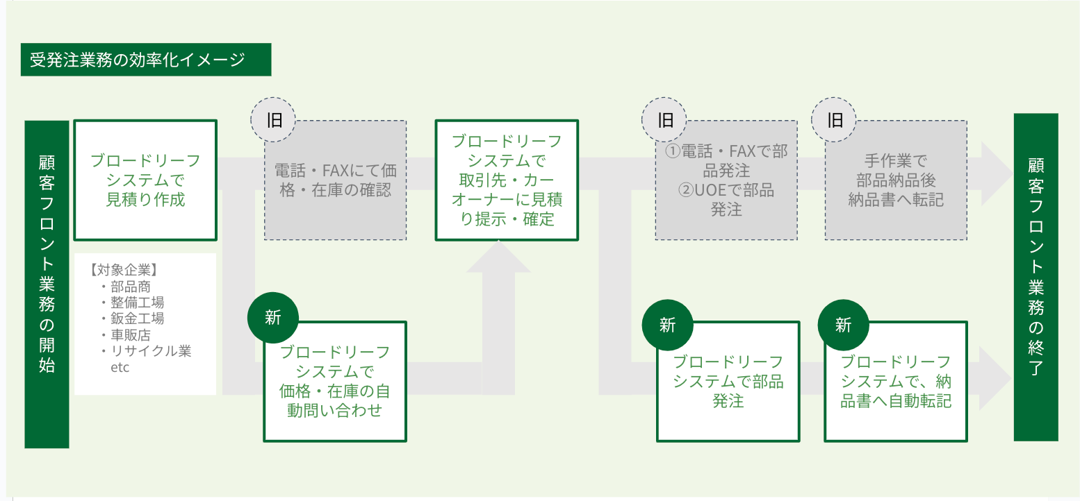 具体的には、トヨタモビリティパーツを通じて行われる自動車部品の受発注に関する業務において、現在主流となっている「紙・電話・FAXを中心としたアナログ業務」を、ブロードリーフが有するIT技術と、自動車整備業などのモビリティ産業の事業者のネットワークを活用することにより、効率化の実現と普及に取り組んでまいります。