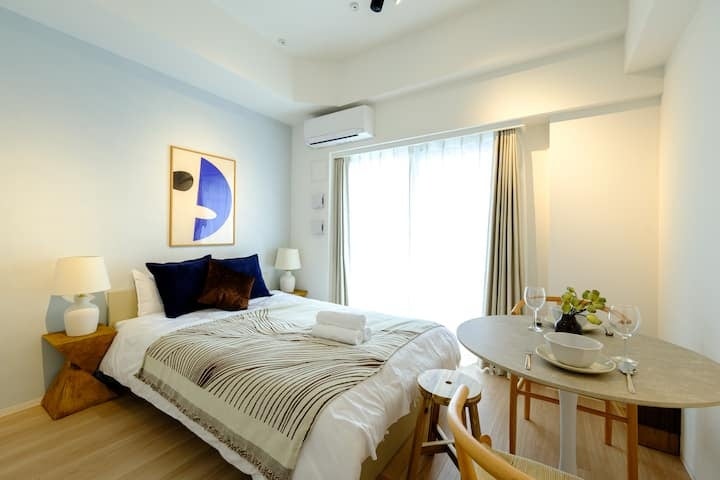 当施設は、大阪メトロ御堂筋線、北大阪急行線「江坂駅」から徒歩7分、阪急千里線「豊津(大阪)駅から徒歩13分の立地にあり、周辺にはコンビニエンスストアやスーパー、お好み焼き屋や鉄板焼き屋を揃える賑わいのある商店街などが充実しています。また、新大阪駅や心斎橋駅などの大阪市内の観光スポットにもアクセスのよいエリアです。室内は、リモートワーク可能なデスク周辺設備と、調理器具付きキッチンや洗濯乾燥機なども揃っており、 出張やビジネスなどでの短期滞在を快適に過ごせる設備が充実しております。