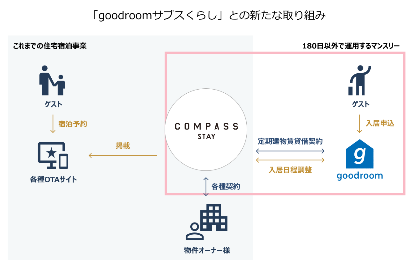 グッドルームが提供する宿泊施設の長期滞在限定のプラットフォーム「goodroomサブスくらし」にて、民泊施設の展開を行う株式会社羅針盤の民泊施設を掲載し募集するという業務提携を行うことにより、民泊新法による年間営業日数制限(通称:180日ルール)が設けられていることで年間の稼働日が制限されるという問題に対し、マンスリーで365日稼働させることが可能となるため新しいソリューションを提供できると考えております。
