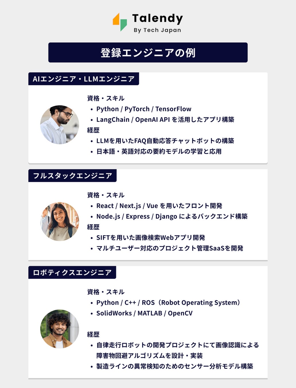 Talendy HubにはAIやロボティクス等の幅広い専門領域で、日本における3~5年目程度のエンジニアスキルを持つ人材が豊富に登録しています。