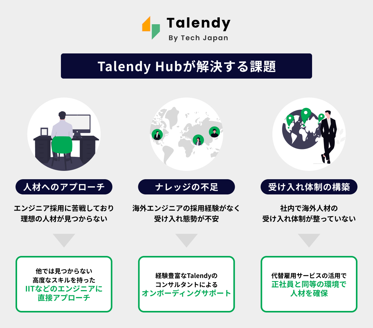 Tech Japanは世界最高峰の理系大学であるインド工科大学(IIT)と提携し、日本企業が効率的に海外エンジニアを確保できるプラットフォーム「Talendy Hub」を開発・運営しています。