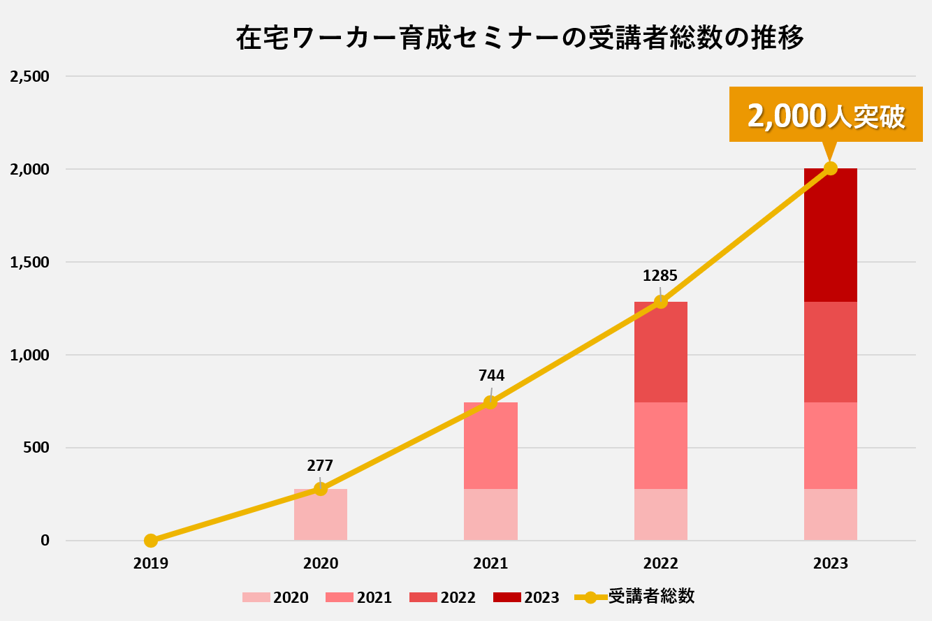 2020年から提供を開始した「在宅ワーカー育成セミナー」は、自治体からの依頼が年々増えており、3年目には受講者数1,000人を達成。4年目となる今年度(2023年)、2,000人を突破しました。