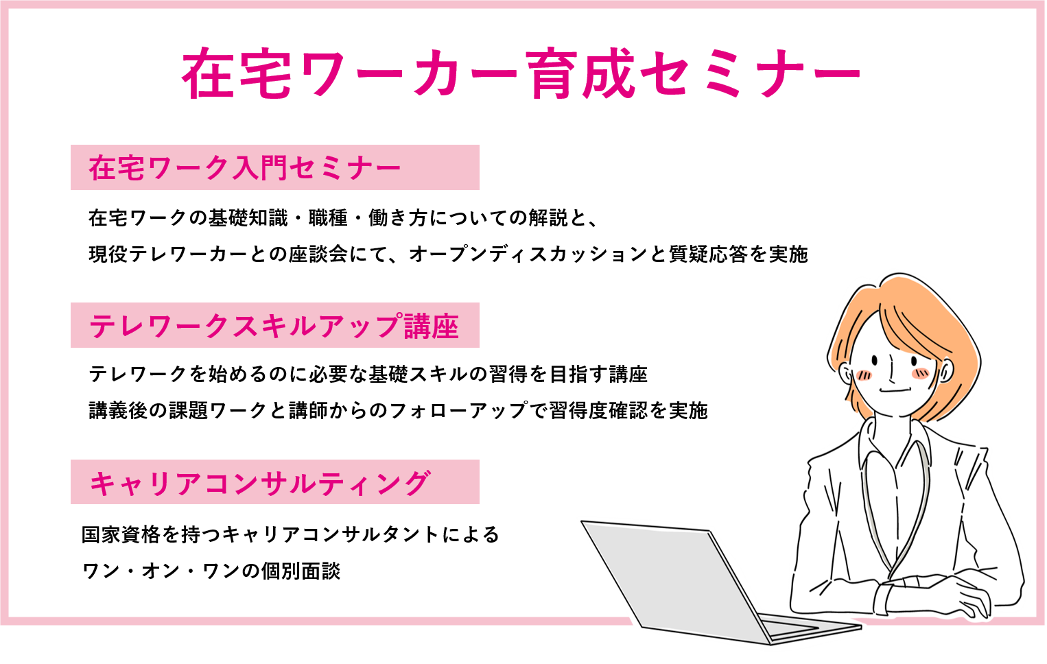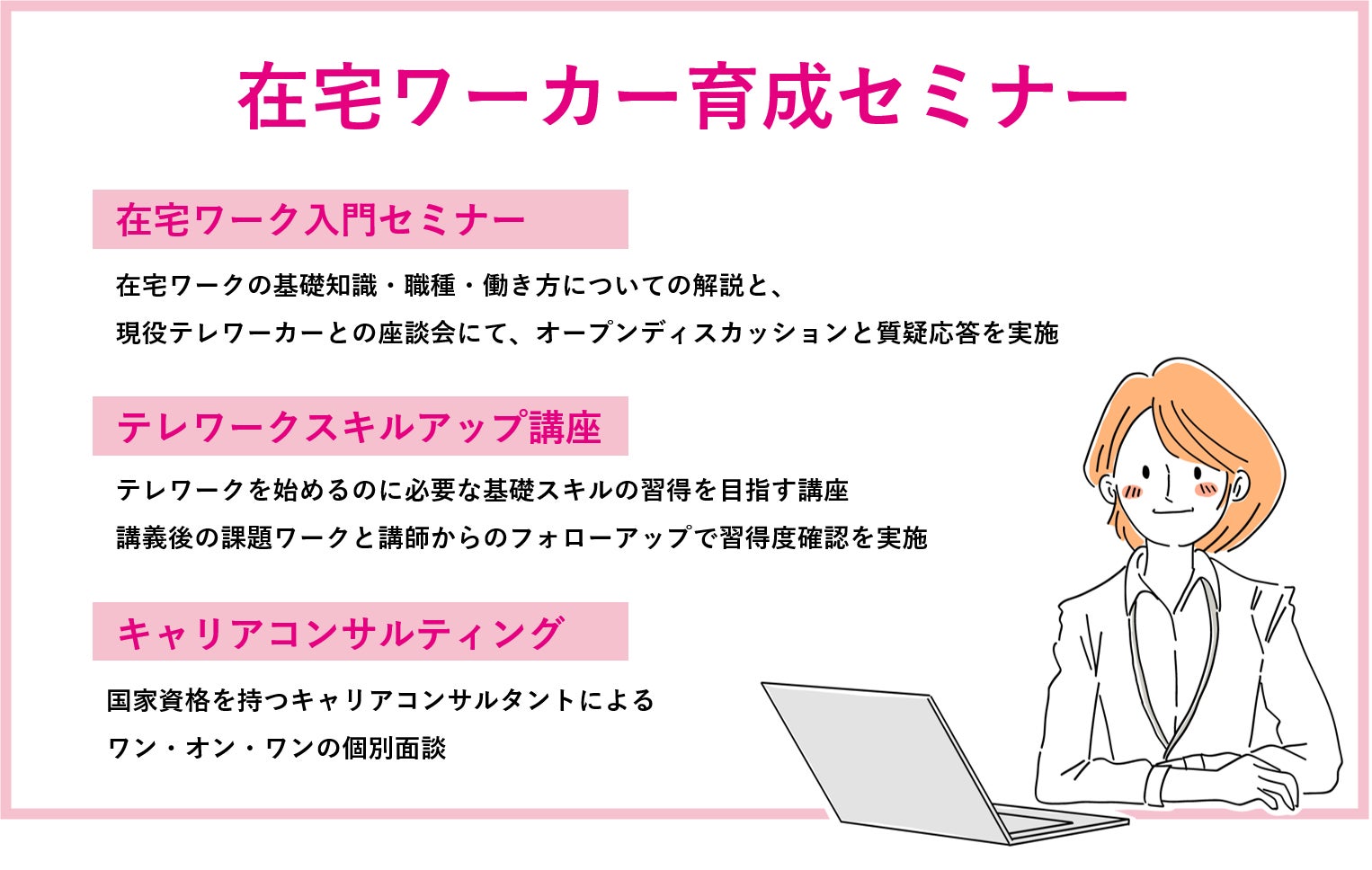 「在宅ワーカー育成セミナー」では、地域の住民を対象に、在宅ワークについての基本知識、職種や働き方、在宅ワークで気をつけるべきポイントやルール、在宅ワークの仕事の探し方等を解説するセミナーと、在宅ワークを始めるために必要な基礎スキルの習得を目的としたスキルアップ講座及び就労支援を実施します。