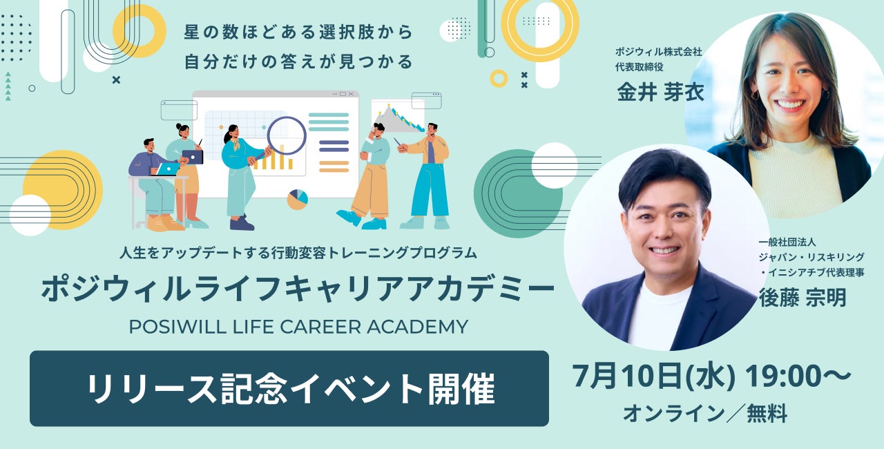キャリアのパーソナルトレーニングサービス『POSIWILL CAREER(ポジウィルキャリア)』を運営するポジウィル株式会社(東京都港区、代表:金井芽衣)は、自分らしい生き方や人生軸を見つけ、自分に合ったスキル習得、人生のアップデートにつながるサブスクリプション型の新サービス『ポジウィルライフキャリアアカデミー』をリリースしました。さらに、サービスリリースを記念して、7月10日(水)19:00より、本サービスの監修者でもある一般社団法人ジャパン・リスキリング・イニシアチブ代表の後藤宗明氏を招いたオンラインイベントを開催いたします。