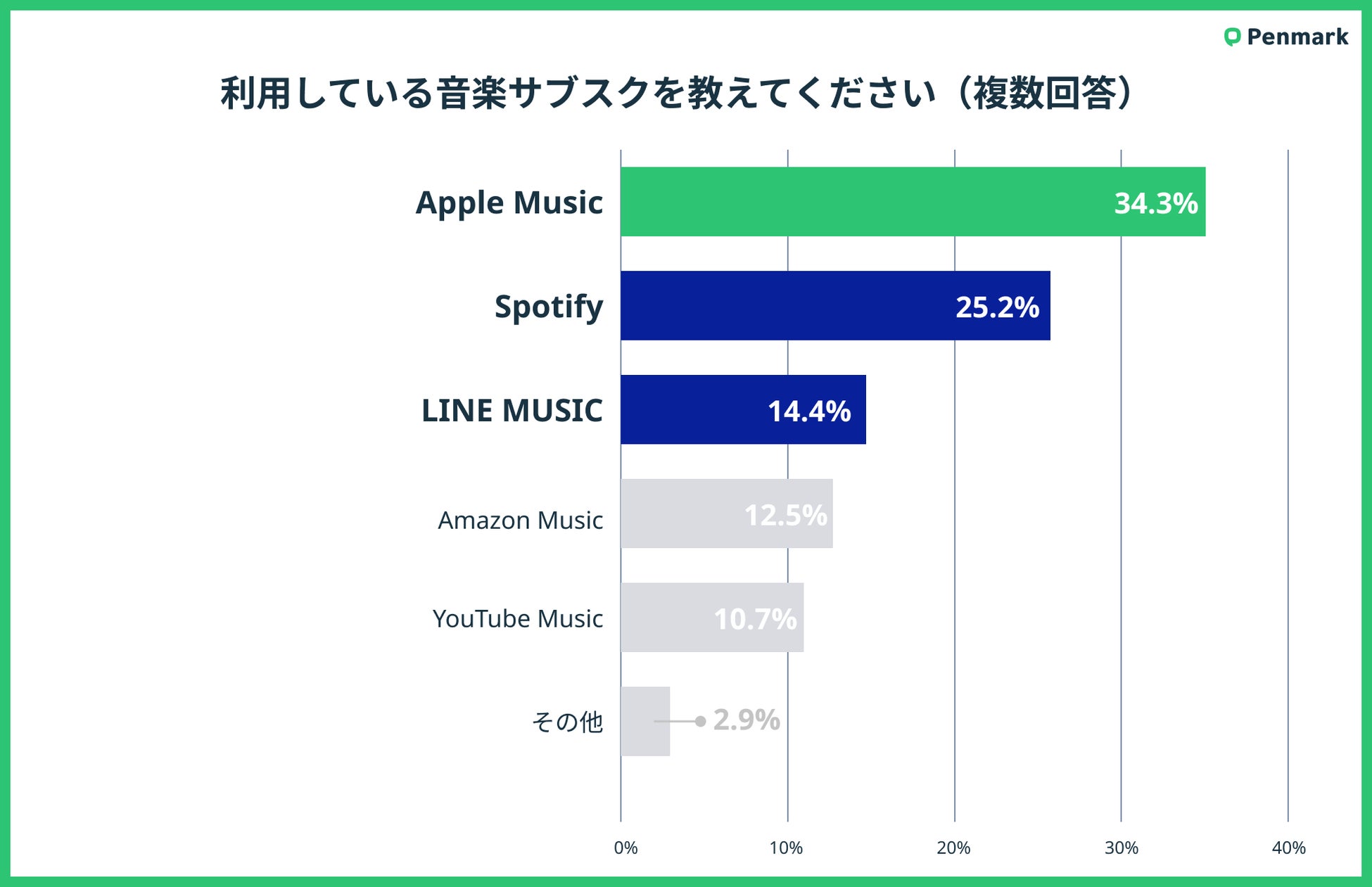 音楽サブスクリプションサービスの利用に関しては、「Apple Music(34.3%)」が最も高く、次いで「Spotify(25.2%)」、「LINE MUSIC(14.4%)」と続く。