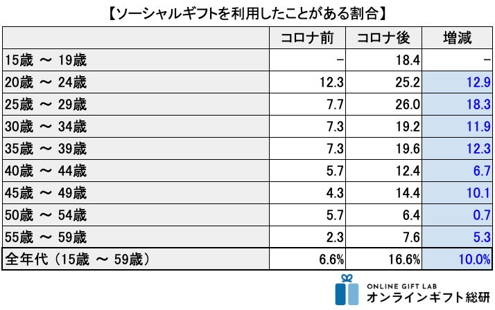 ネットで購入してSNS等でURLを贈るサービスは「ソーシャルギフト」と呼ばれており、この数年で利用者が急増しています。このサービスの利用経験がコロナ前後で+10.0%と急増しました。これはコロナ禍の外出自粛により、店頭での購入機会やギフトを手渡しする機会が減少したことをきっかけにして、インターネットを利用した新たなギフトの購入の仕方・贈り方の認知が拡大したと考えられます。コロナ後はコロナ前と比較すると2.5倍以上に増加し、6人に1人は利用経験がある(16.6%)サービスとなりました。