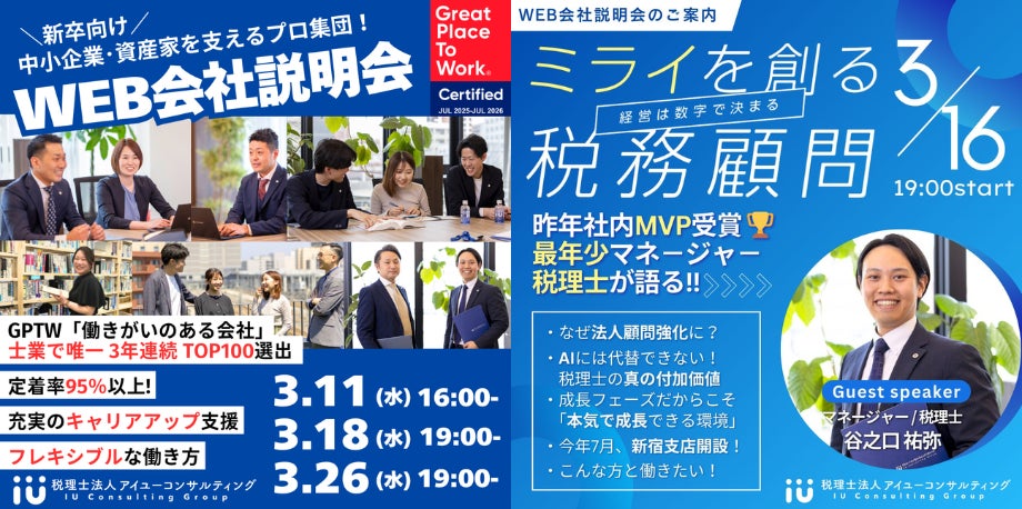 税理士法人を母体に国内外15拠点で各種コンサルティングサービスを展開するアイユーコンサルティンググループ(本社:東京都豊島区、グループ代表:岩永悠/グループ共同代表:出川裕基、以下「当グループ」)は、Great Place to Work®InstituteJapan(GPTWジャパン)が発表する2026年版「働きがいのある会社」ランキングにおいて、士業で唯一ベスト100に選出されたことをお知らせいたします。