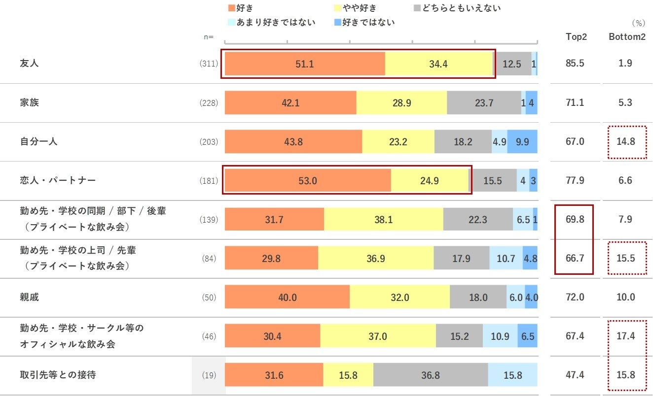 一緒にお酒を飲む相手の好嫌度は、「友人」「恋人・パートナー」がTop2で8割前後と特に高い。