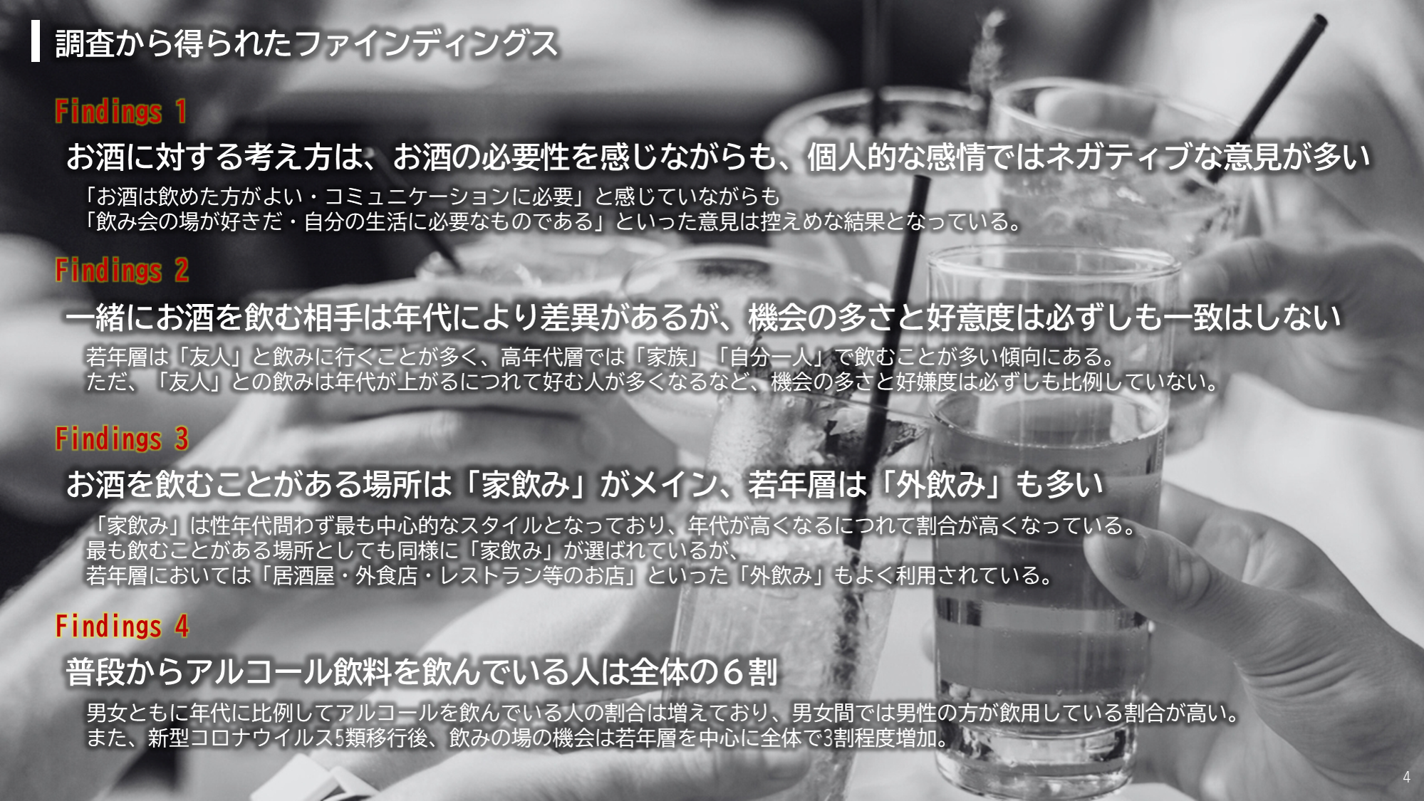 そこで、日本インフォメーション株式会社(代表取締役社長:斎藤 啓太以下、日本インフォメーション)では、コロナ禍を経た今、人々のアルコール飲料に対する意識がどのように向けられているのか等、性年代別での実態を把握するために本調査を実施しました。