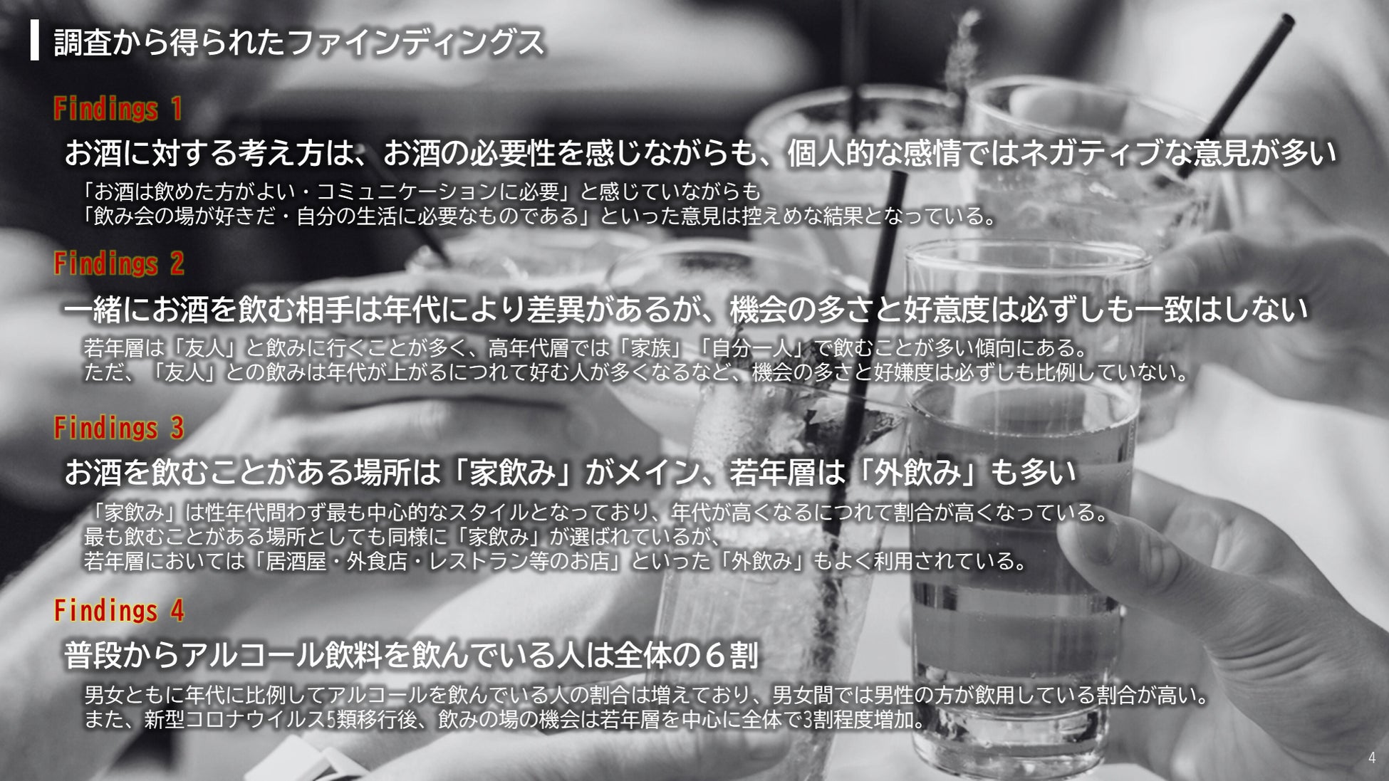 2023年5月に実施した今回の調査では、年代差によるアルコール飲料や飲み会の機会に対する様々な意識に違いが見られました。コロナ後には飲み会の機会は増えている傾向が徐々に見られ、今後さらに3年間の自粛を経た結果、意識や行動に大きな変化がありそうです。以上、~アフターコロナでどう変わる?~アルコール飲料に関する意識実態調査の結果を抜粋してお伝えしました。