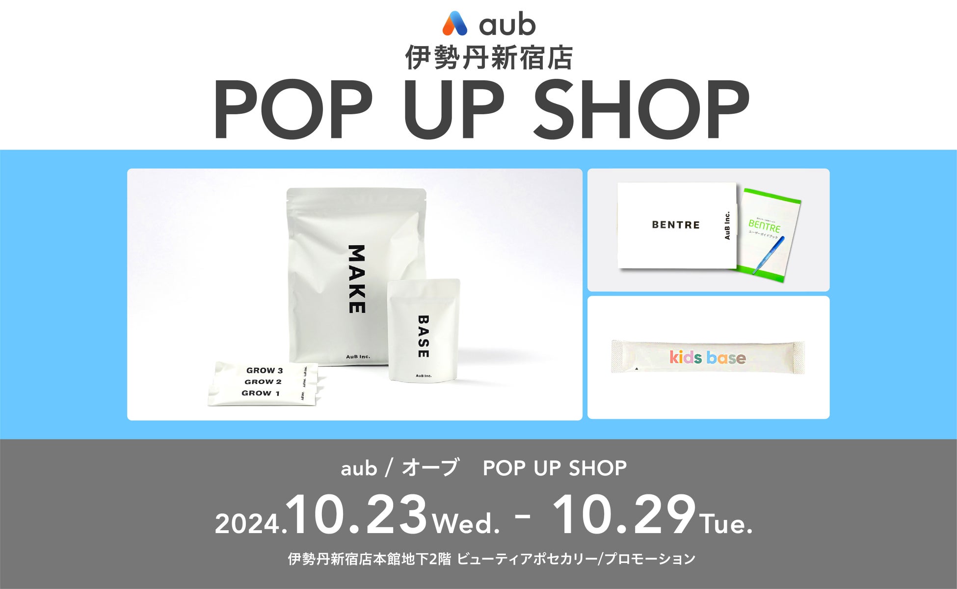 POP UP SHOP では、腸内フローラをケアする酪酸菌や乳酸菌、ビフィズス菌など約30種類の菌を配合したサプリメント「aub BASE」や、こども向けおなかケア食品「kids base」、腸内細菌検査キット「BENTRE」など普段はオンラインでしか購入できないaubの腸ケア商品のほか、今はここでしか買えない限定セットの販売を行います。