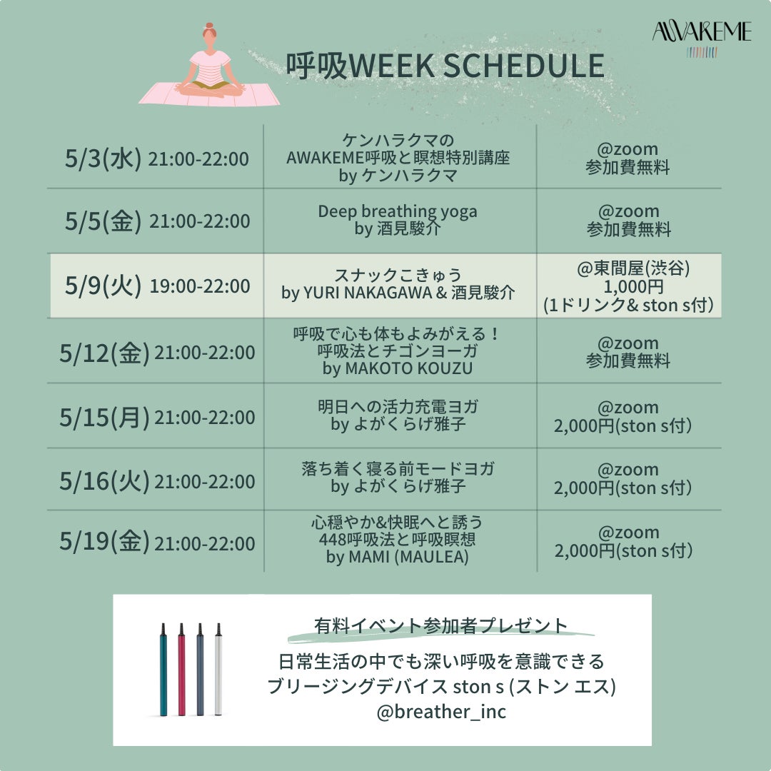 「AWAKEME 呼吸WEEK」開催決定! 5月9日の「呼吸の日」にちなんで、呼吸にフォーカスしたオンラインレッスンとリアルイベントを全7回実施。5月9日には「スナックこきゅう」を渋谷円山町で開店!