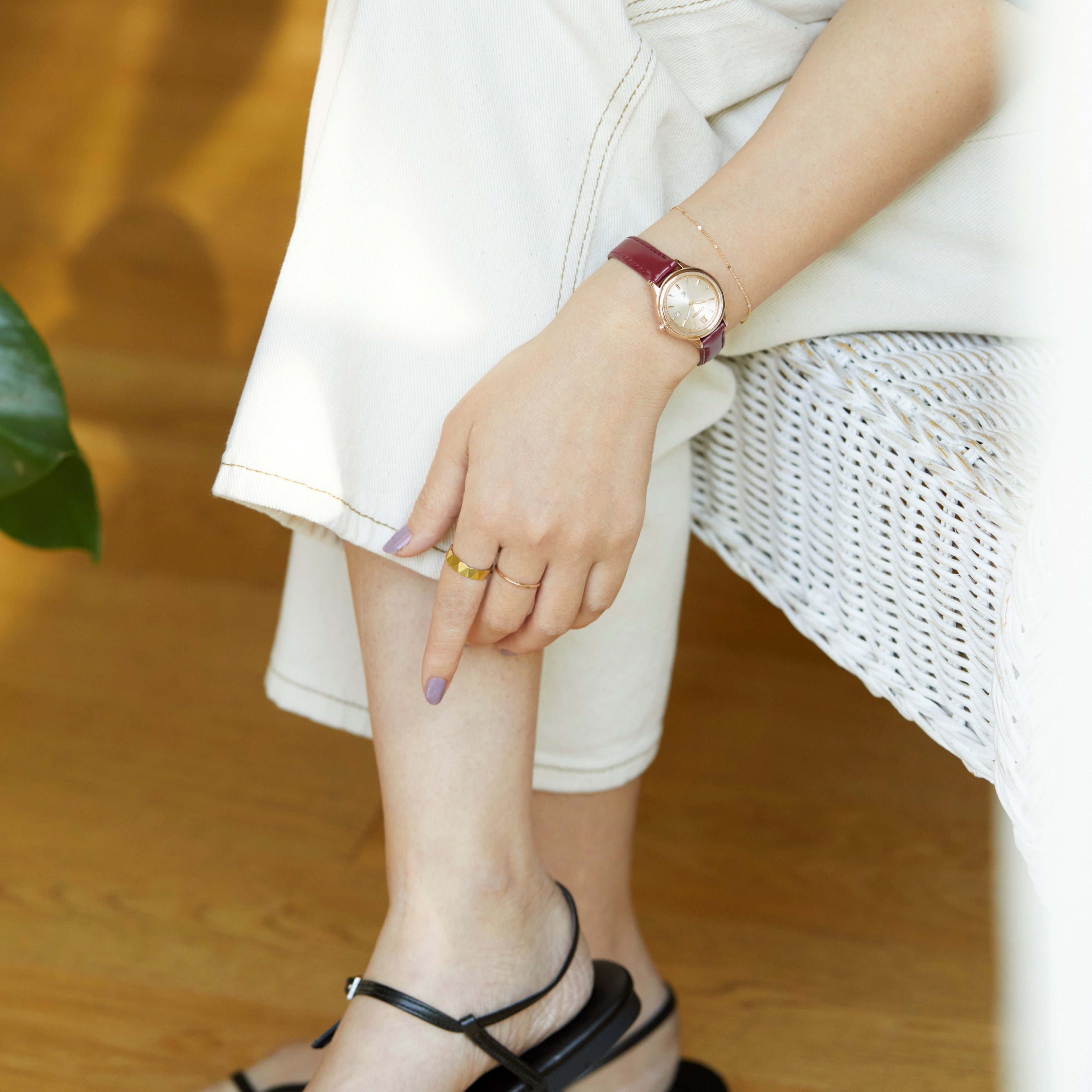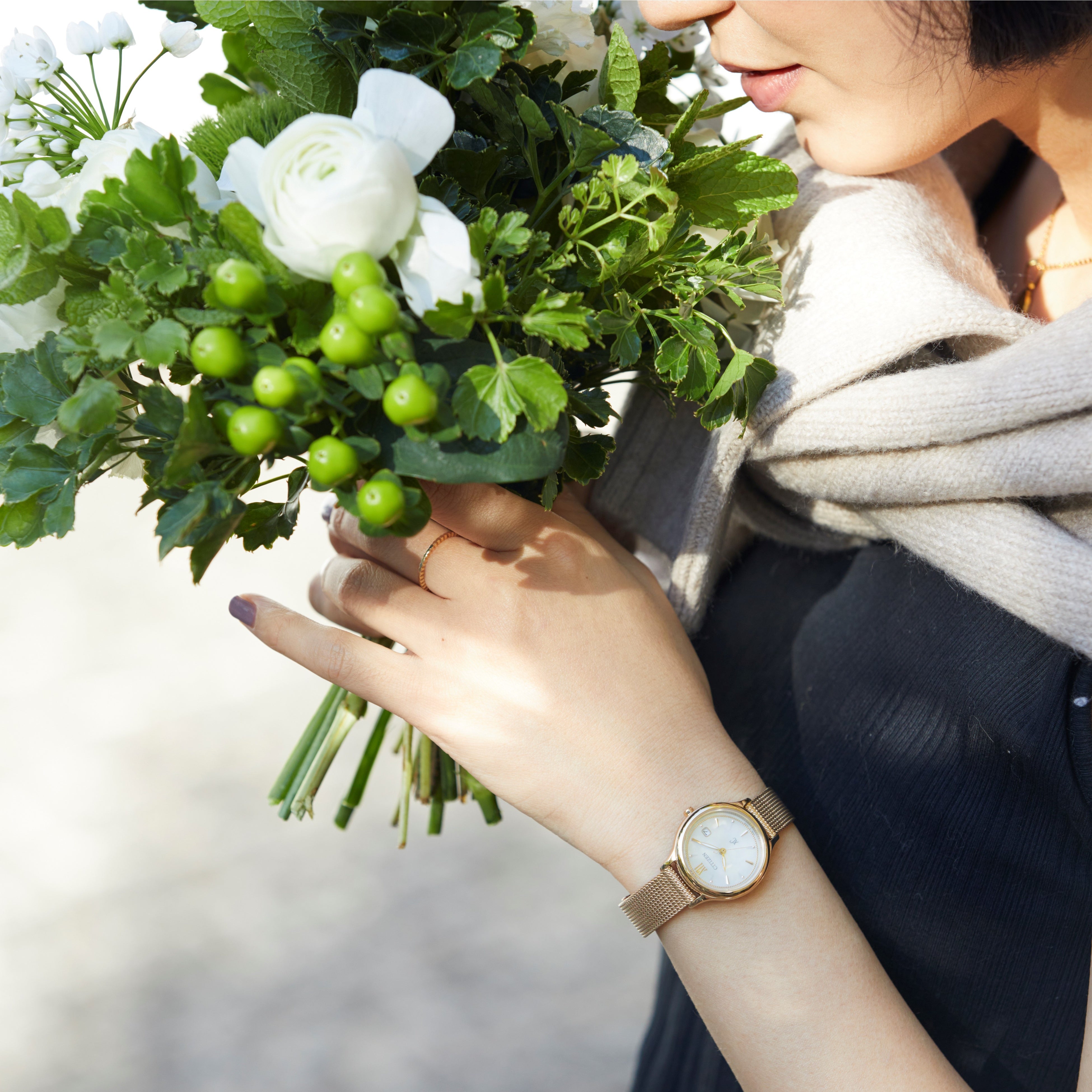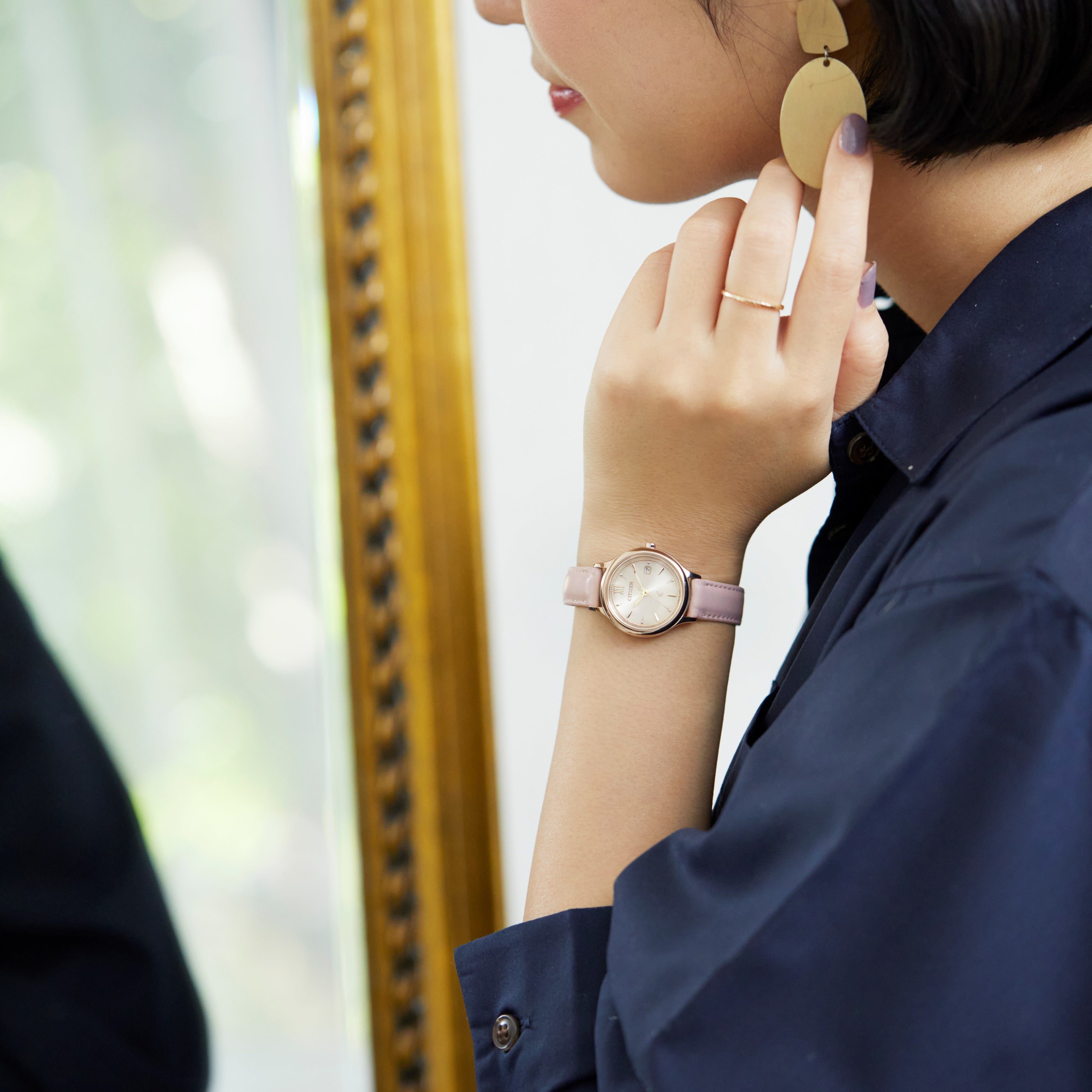 「mizu コレクション」ならではの、透明感あふれるカラーとやわらかなフォルムが印象的なデザイン。ミルグレインリングをあしらった文字板や丸みのあるケースラインが特長です。「シルバー」「ウォームゴールド」「サクラ」の3色で展開します。