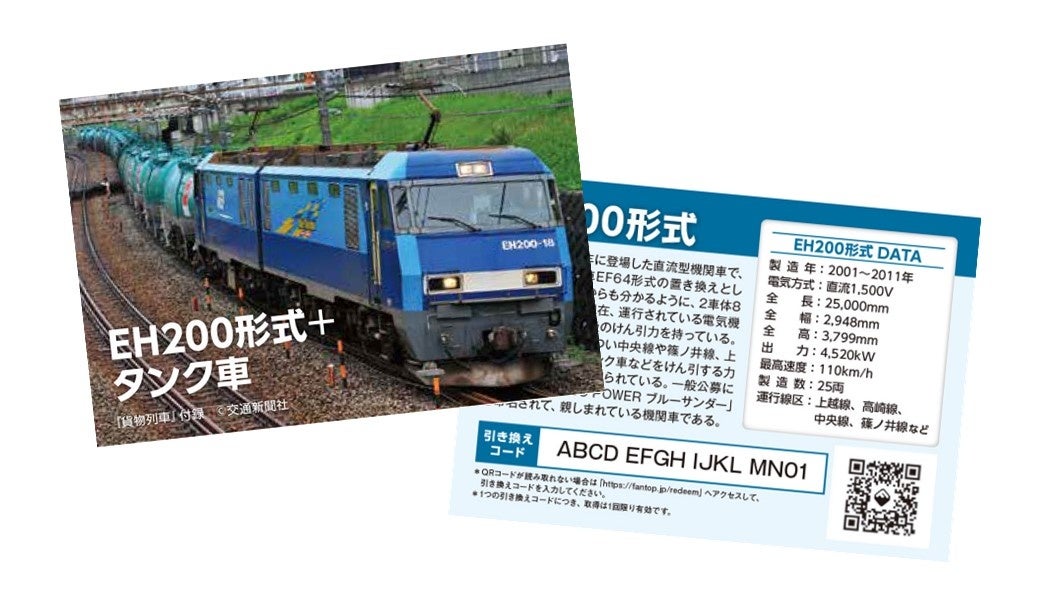 NFTデジタル特典は交通新聞社オリジナル「コレクションカード」の裏面QRコードから取得可能です。カードの図柄は「EH200形式+タンク車」、裏面にはEH200形式の詳細スペックもあり、コレクションカードとしてもお楽しみいただけます。