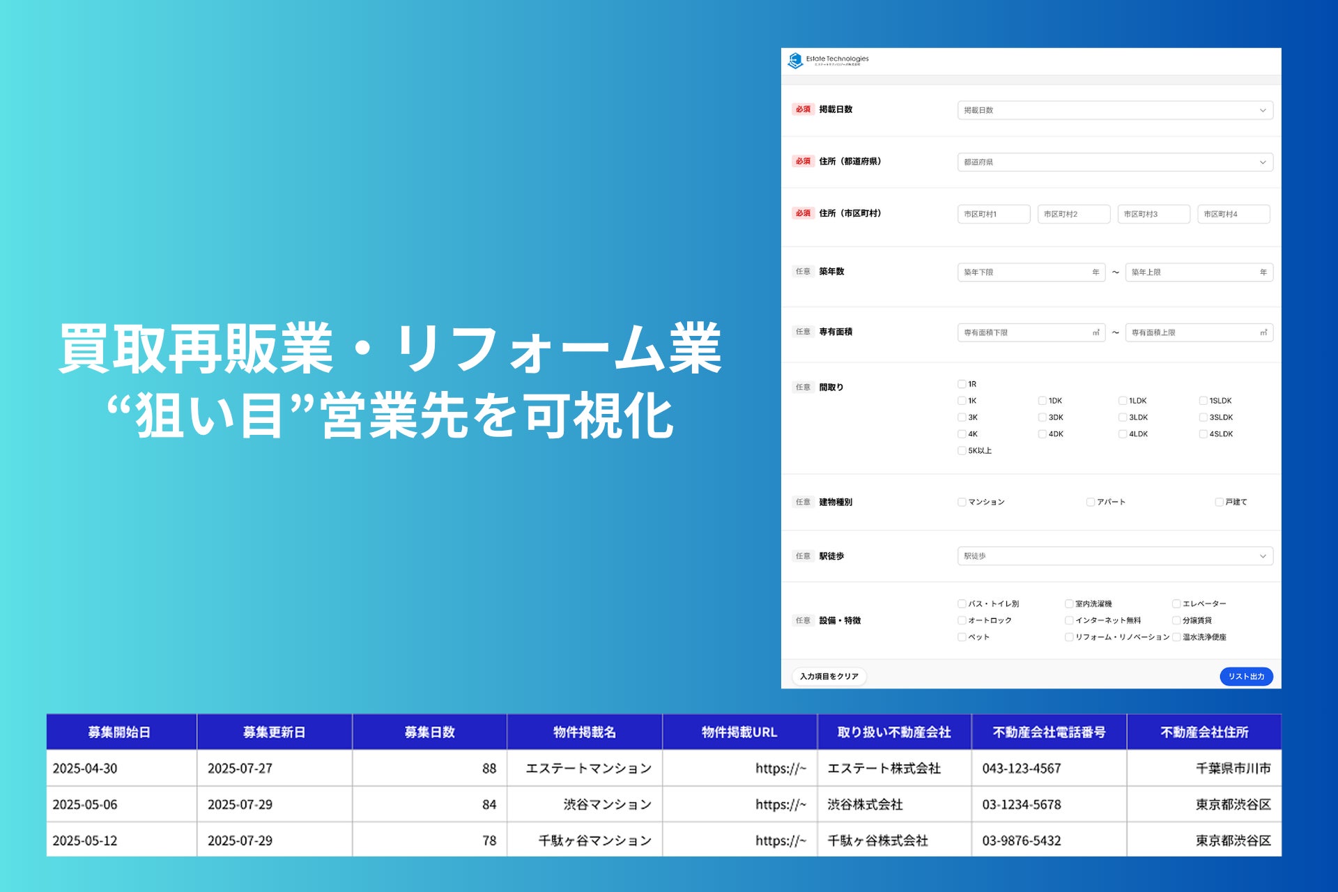 AIによるビッグデータ解析を強みとする、エステートテクノロジーズ株式会社(本社:東京都渋谷区、代表取締役:澤 博史)は、保有する全国の不動産ビッグデータから、長期空室・販売中物件を複数条件で絞り込んで出力できる「長期空室・販売中物件リスト出力システム」の提供を開始しました。建物種別はマンション・アパート・戸建に対応しています。