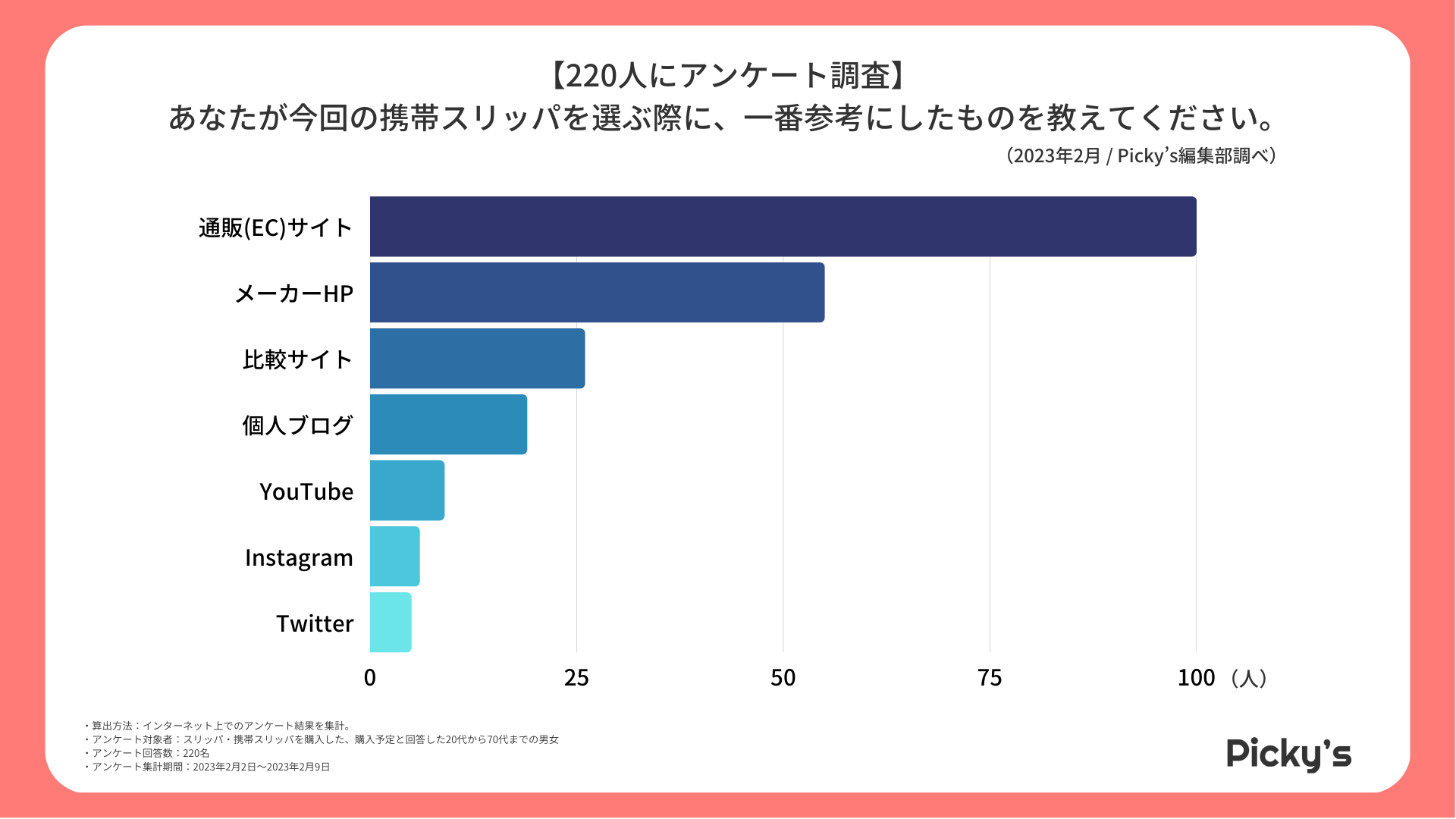 「Picky’s」は、インターネットショッピングにおいて、購入前に試せない・選ぶべきものがわからないという課題の解決を目標に、あらゆる商品のおすすめランキングや検証レビューを紹介するサイトです。このたびPicky’s(https://rentry.jp/note/)では、2023年3月8日スリッパを楽しむ日に先駆けて、スリッパ・携帯スリッパについてインターネット上でアンケート調査を行いましたので発表いたします。
