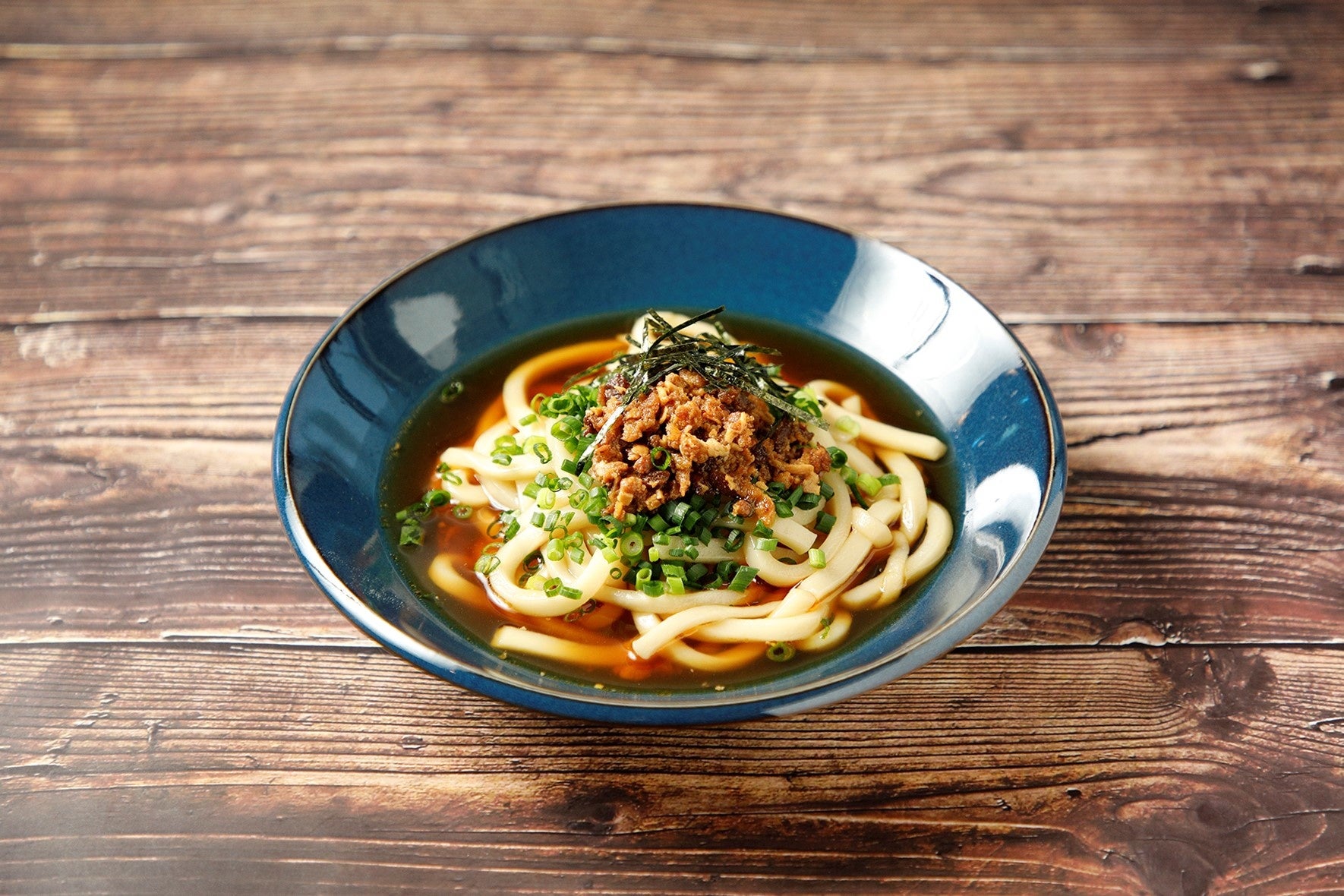 ご自宅のいつものうどんに「かけるチキン。」を上からのせて、お好みで万能ねぎや刻みのりをかけるだけ!