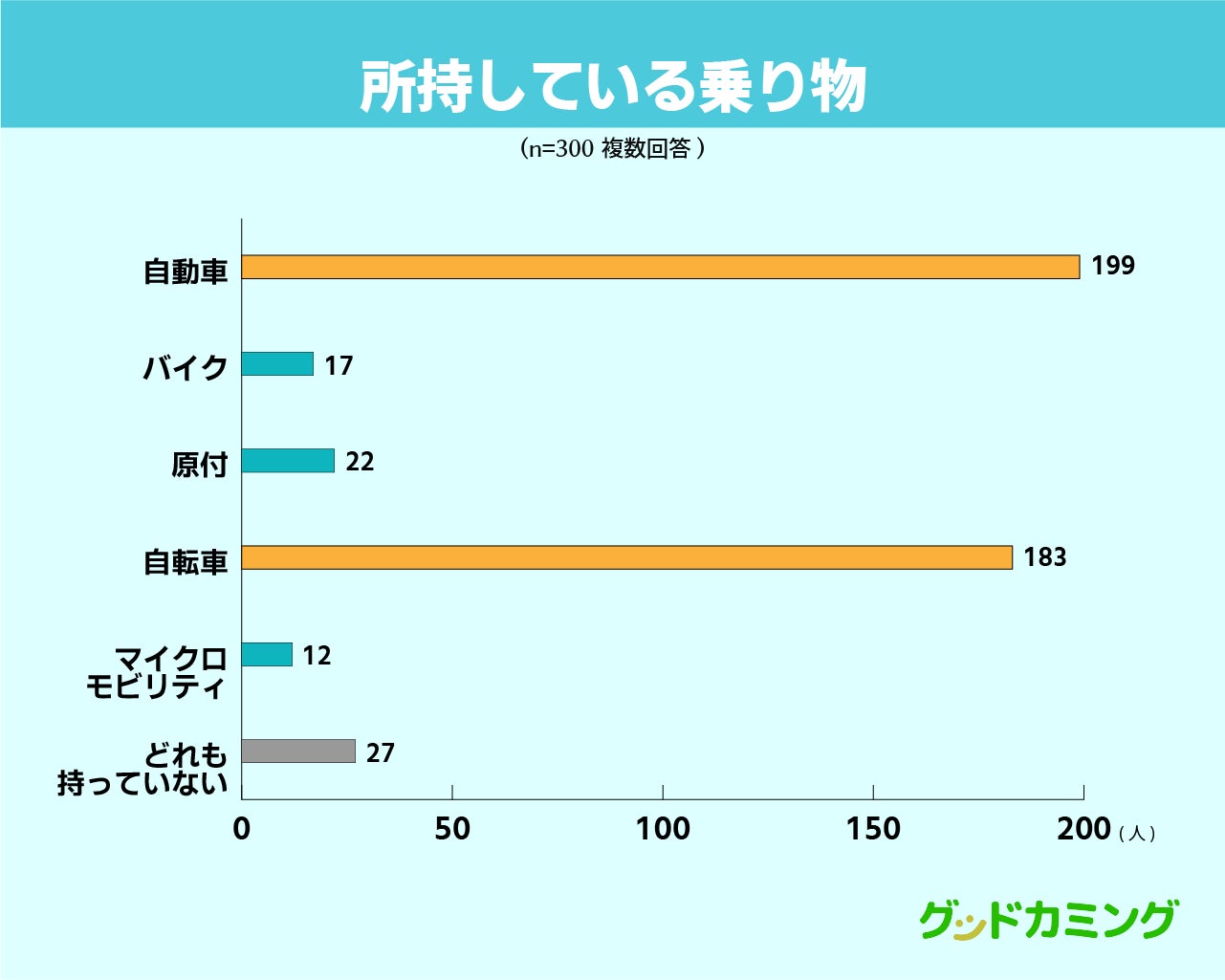 「自転車」61.0%(183人)も所持している層が多数派でしたが、裏を返せば39.0%は「自転車を所持していない」結果となりました。